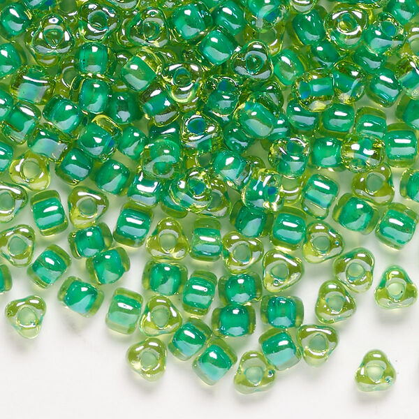 Seed bead, Miyuki, glass, transparent amber yellow color-lined kelly green, (TR1811), #5 triangle. Sold per 250-gram pkg.