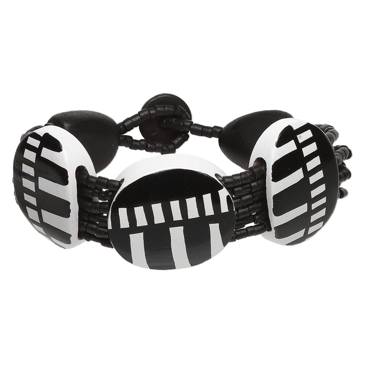 Bracelet, painted wood and coconut shell, black and white, 8 inches with button clasp. Sold individually.
