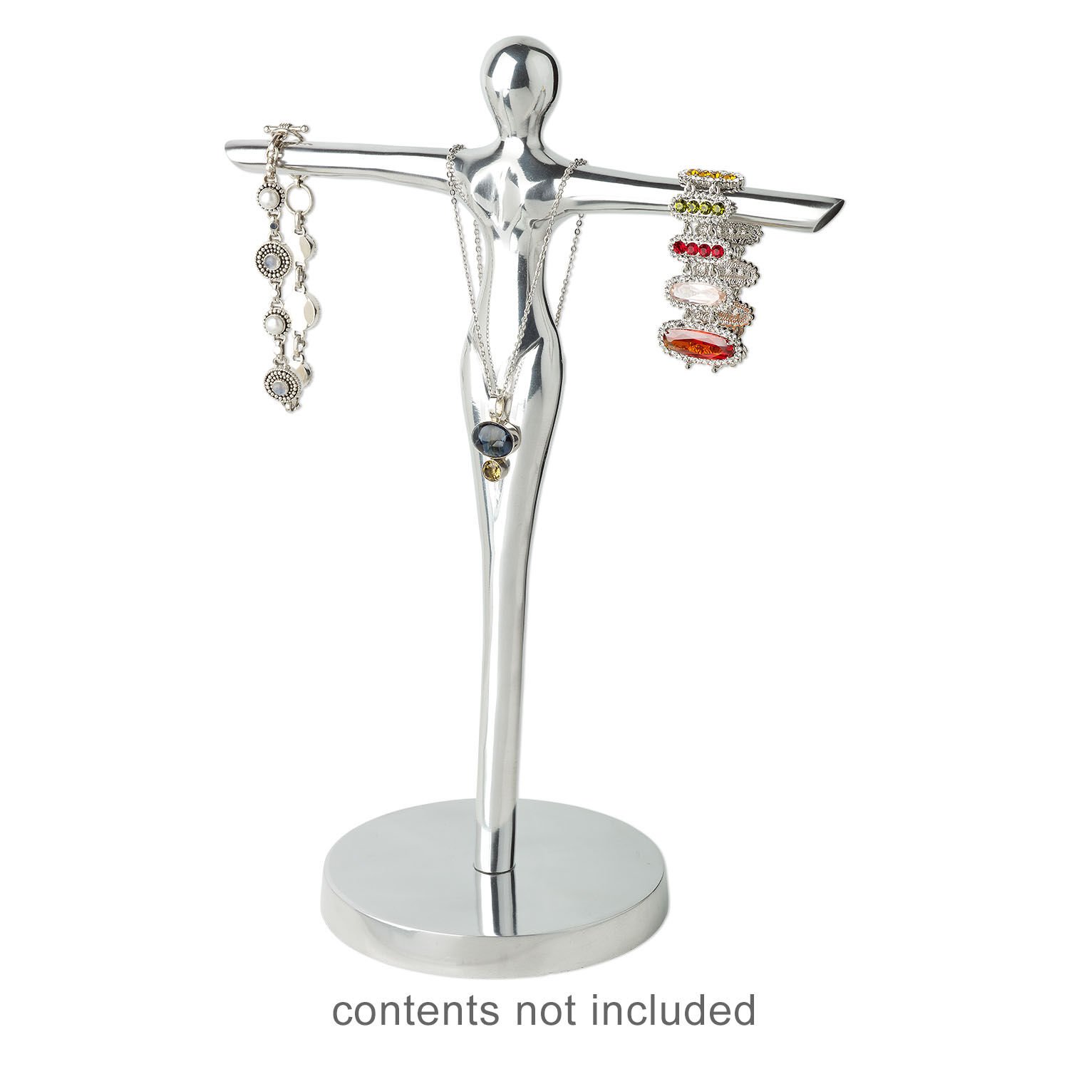 Sculptural display has a seamless polished aluminum surface. Jewelry elegantly drapes on this handmade mannequin for a modern and artistic display. Made of recycled aluminum, this hollow display is economical and lightweight. The felt base protects tables and other surfaces from scratching.