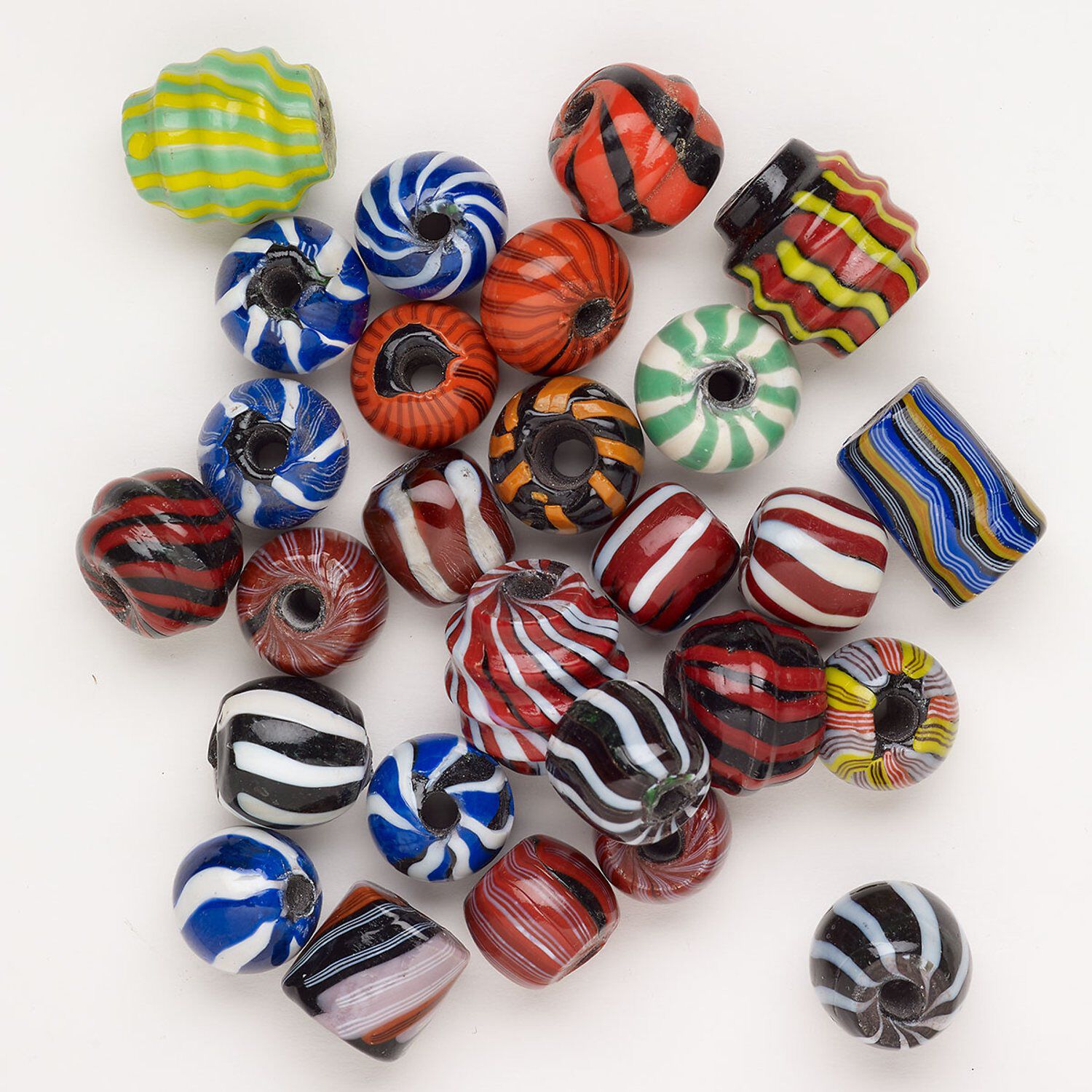 Colors can include blue, white, red and more. Shapes can include tube, barrel, round and more. Package contains approximately 25 beads. Items are made with solid color glass, which means the base color of the glass is saturated throughout the object and will not fade or rub off over time. These beads may be lined with heavy amounts of kaolin (also called "China clay"), a fine white clay used to prevent molten glass from sticking to the steel rod during beadmaking. It can be easily removed with water. Drill holes accept stringing material up to 3-4mm.