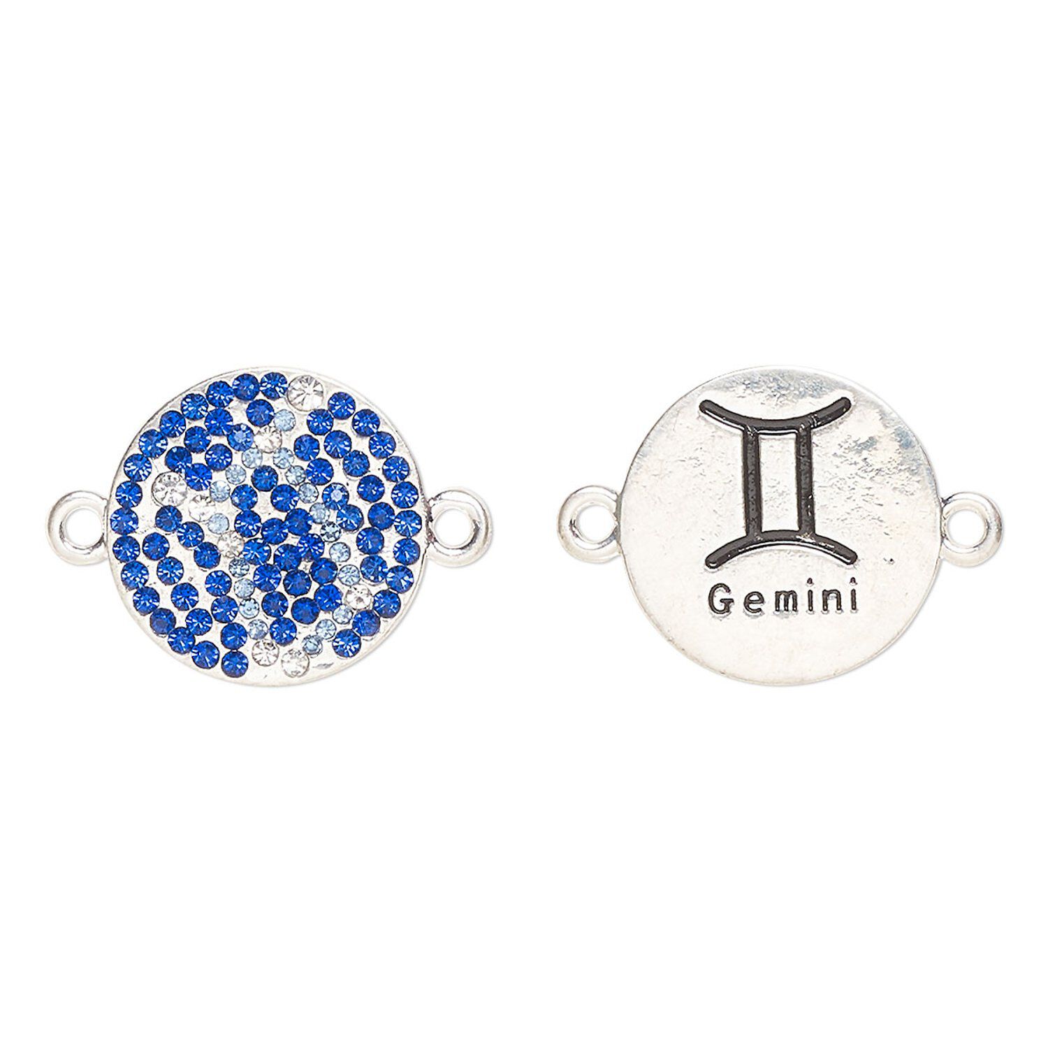 Link, "pewter" (zinc-based alloy)/enamel/cubic zirconia, pkg/1, antique silver finish and mixed colors, 20mm round 2-sided with "Gemini" and zodiac symbol.