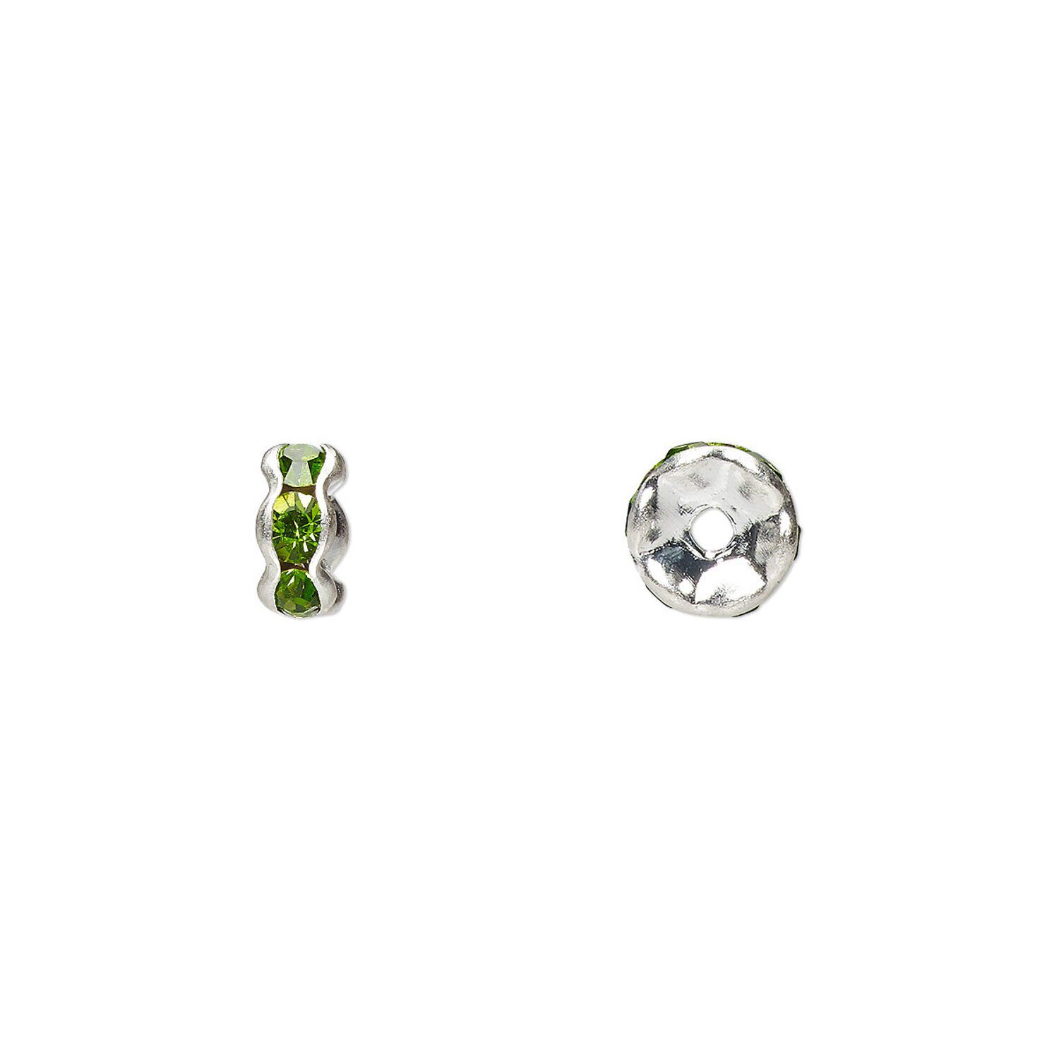 Bead, glass rhinestone and silver-plated brass, peridot green, 6x3mm rondelle. Sold per pkg of 10.