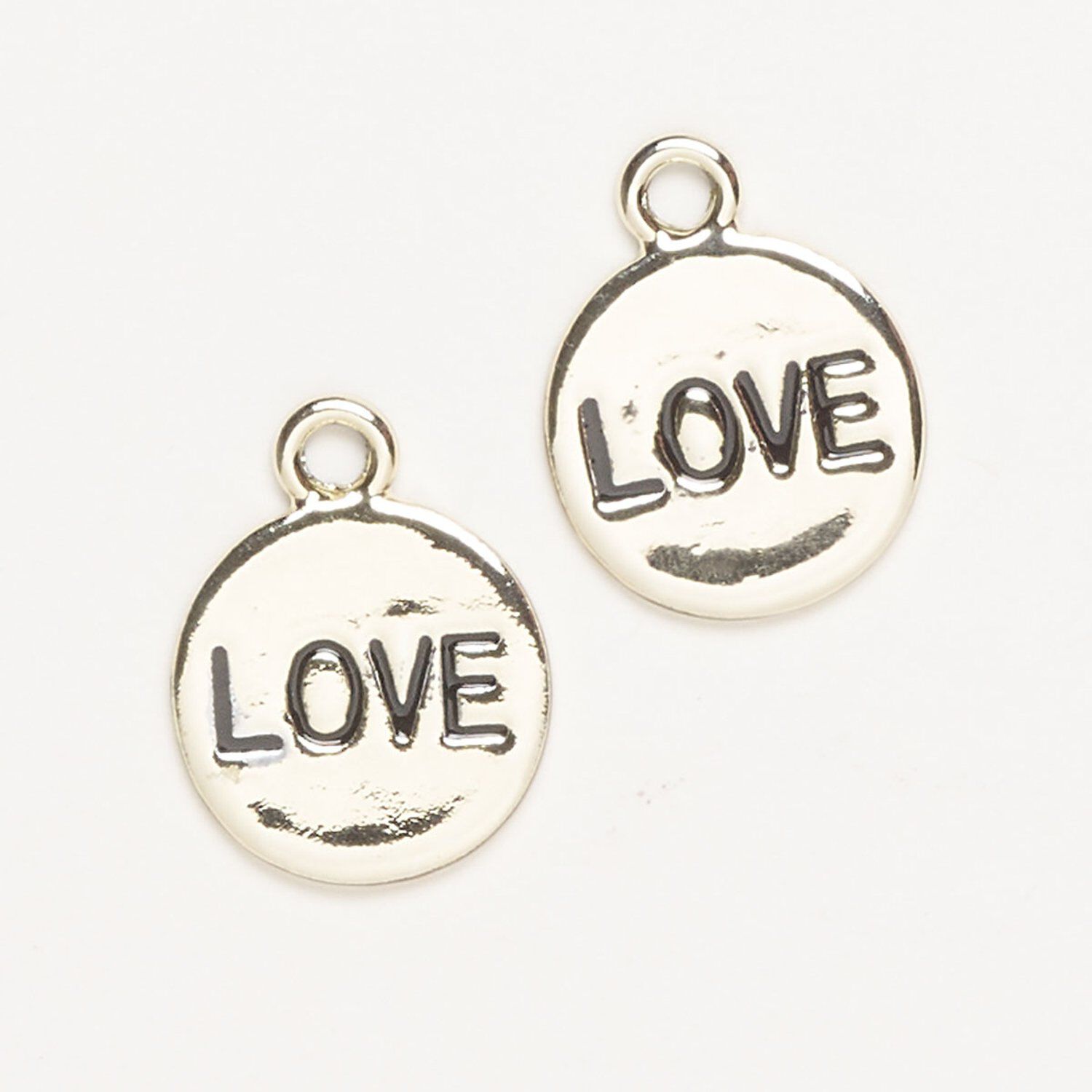 Charm, "pewter" (zinc-based alloy)/steel/enamel, pkg/2, antique silver finish and black, 15mm single-sided round with "LOVE."