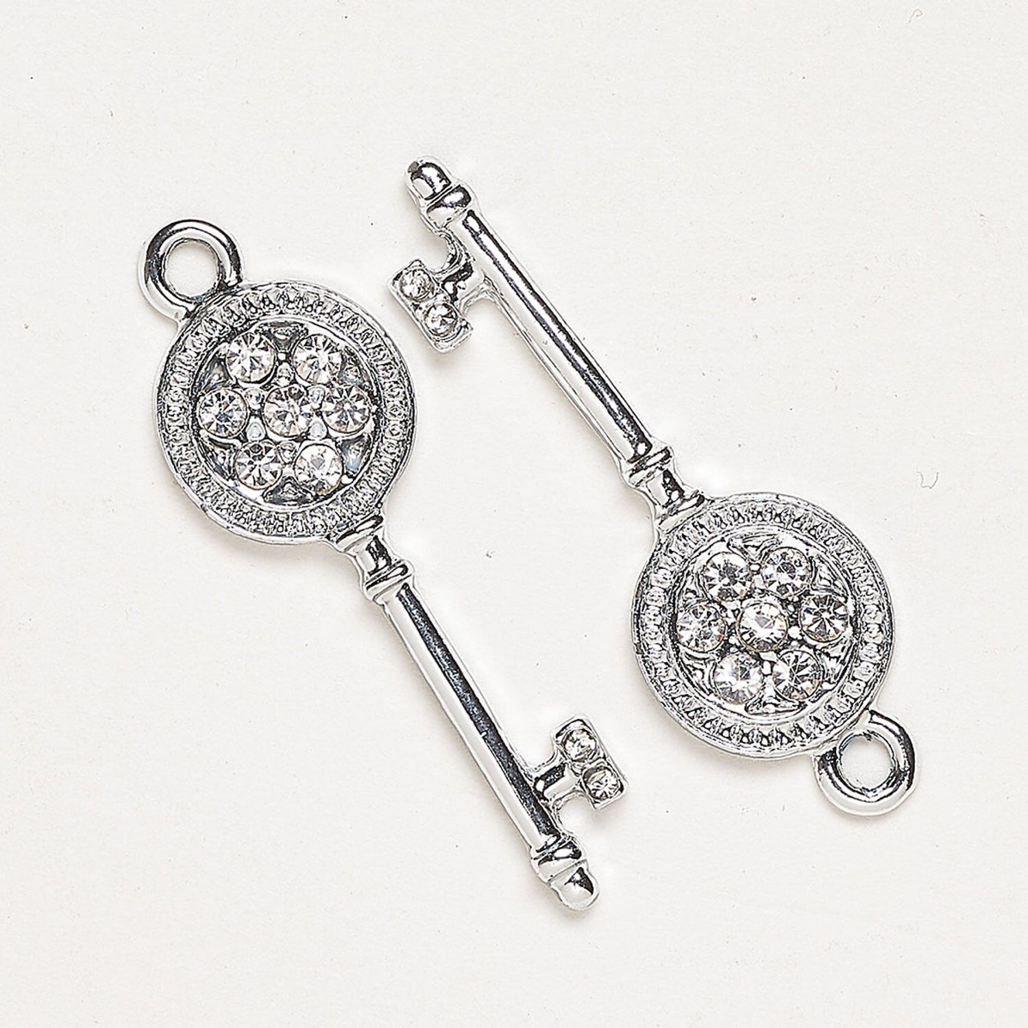 Charm, "pewter" (zinc-based alloy) and glass, pkg/2, silver finish and clear, 30x11mm single-sided key.