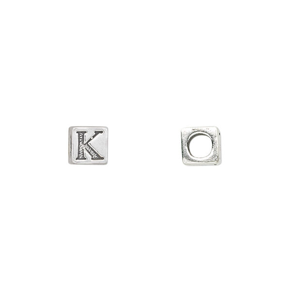 Bead, sterling silver, 5.5mm cube with alphabet letter "K." Sold individually.