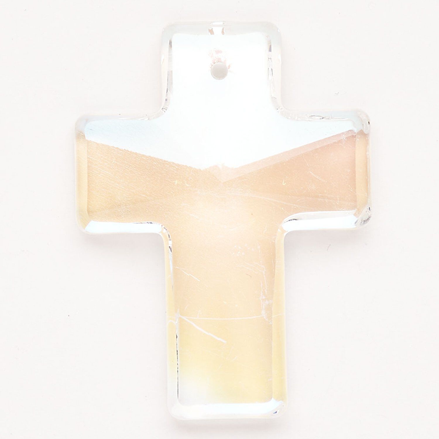 Focal glass 1pk 40x29mm-40x30mm faceted cross, transparent clear AB peach