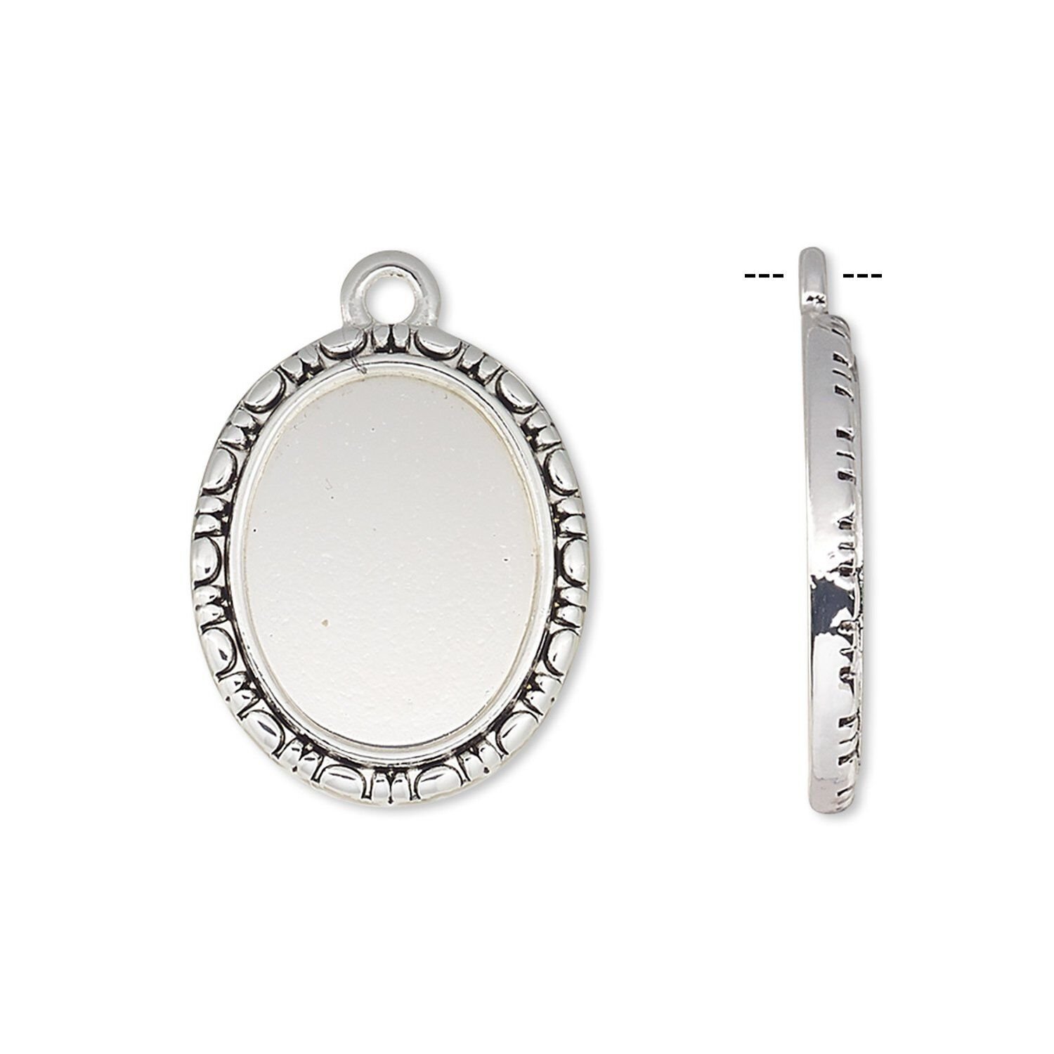 Cast "pewter" (zinc-based alloy) cabochon drop mountings are calibrated to accept a 16x12mm oval cabochon, just bond with E6000® or 2-part epoxy. Mountings can also be filled with Apoxie® Sculpt and polymer clays--or add photos, art clippings or other embellishments under ICE Resin®. Quality casting offers consistent sizes, shapes, finishes, surfaces and metal integrity.