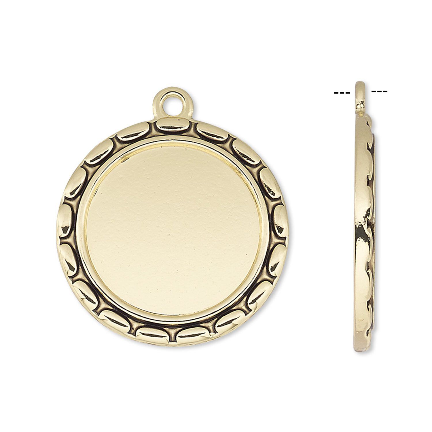 Drop, antique gold-finished "pewter" (zinc-based alloy), 24mm round with oval edge and 18mm round setting. Sold per pkg of 6.