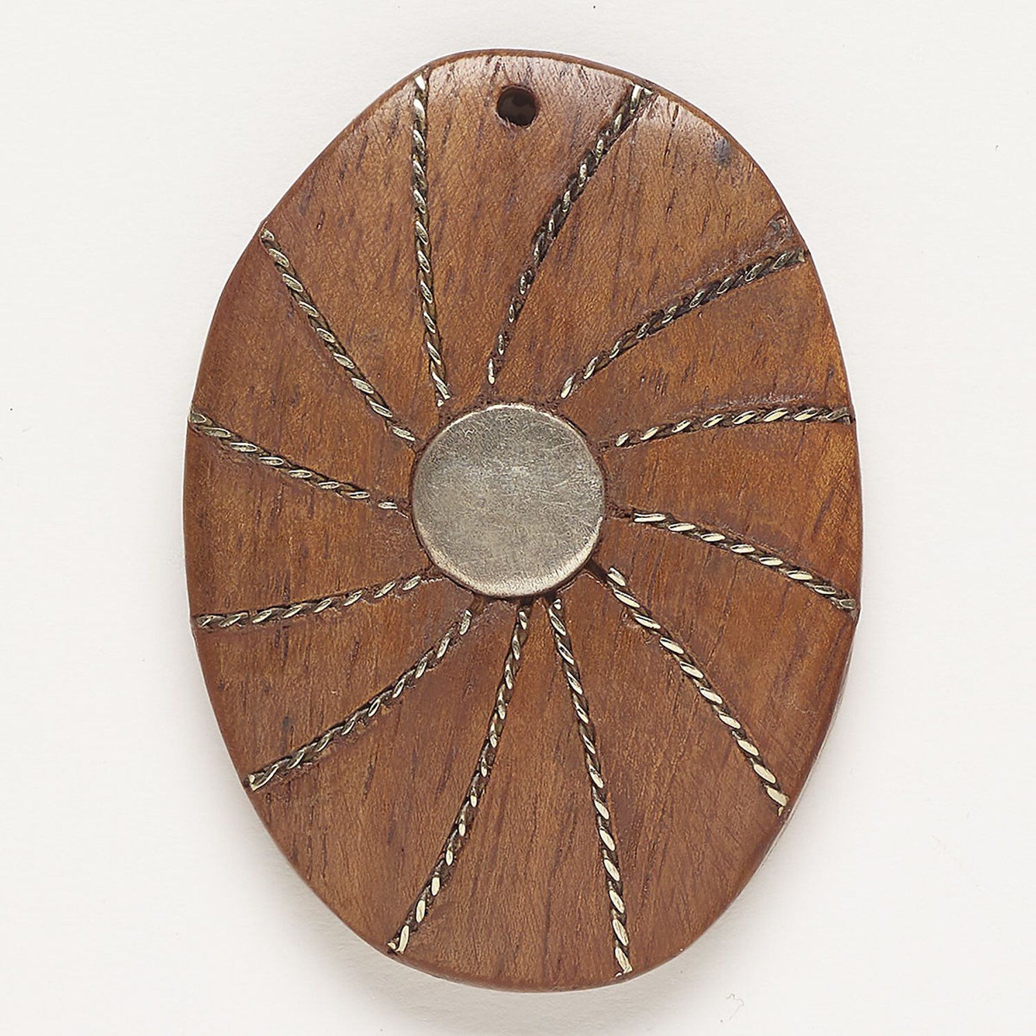 Focal, copper and wood (dyed), pkg/1, 46x33mm-46x35mm top-drilled flat oval with twisted wire inlay and flat back, antique silver finish.