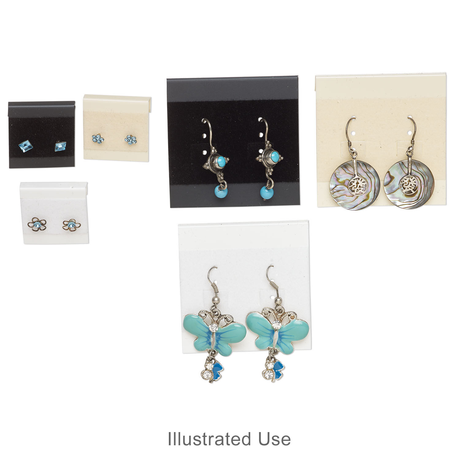 Versatile earring cards have holes that can accommodate most leverback, stud or earwire-style earrings. Molded back lip is compatible with many hanging-type earring displays. Best-selling neutral colors provide a nice showcase for designs without overpowering the jewelry. Each package contains 50 acrylic-backed, flocked earring cards in a random mix of matte black, cream and off-white colors.