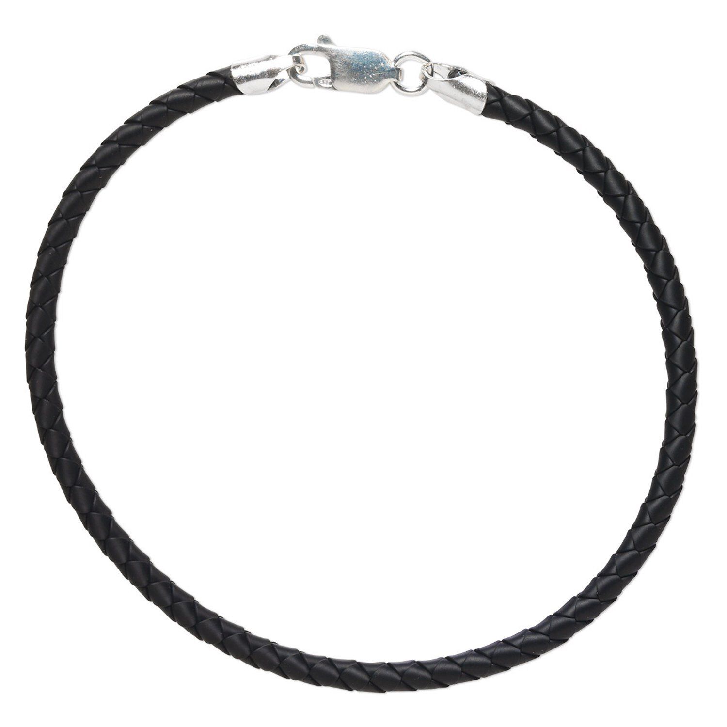 Bracelet cord, rubber and sterling silver, black, 3mm braided, 7 inches with lobster claw clasp. Sold individually.
