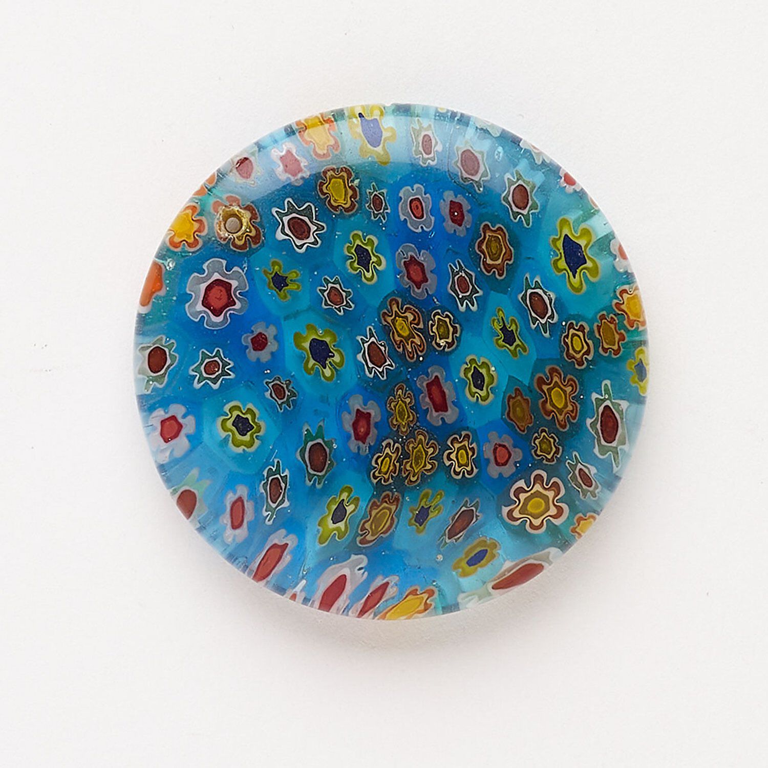 Focal, millefiori glass, pkg/1, 30mm top-drilled puffed flat round, translucent aqua blue and multicolored.