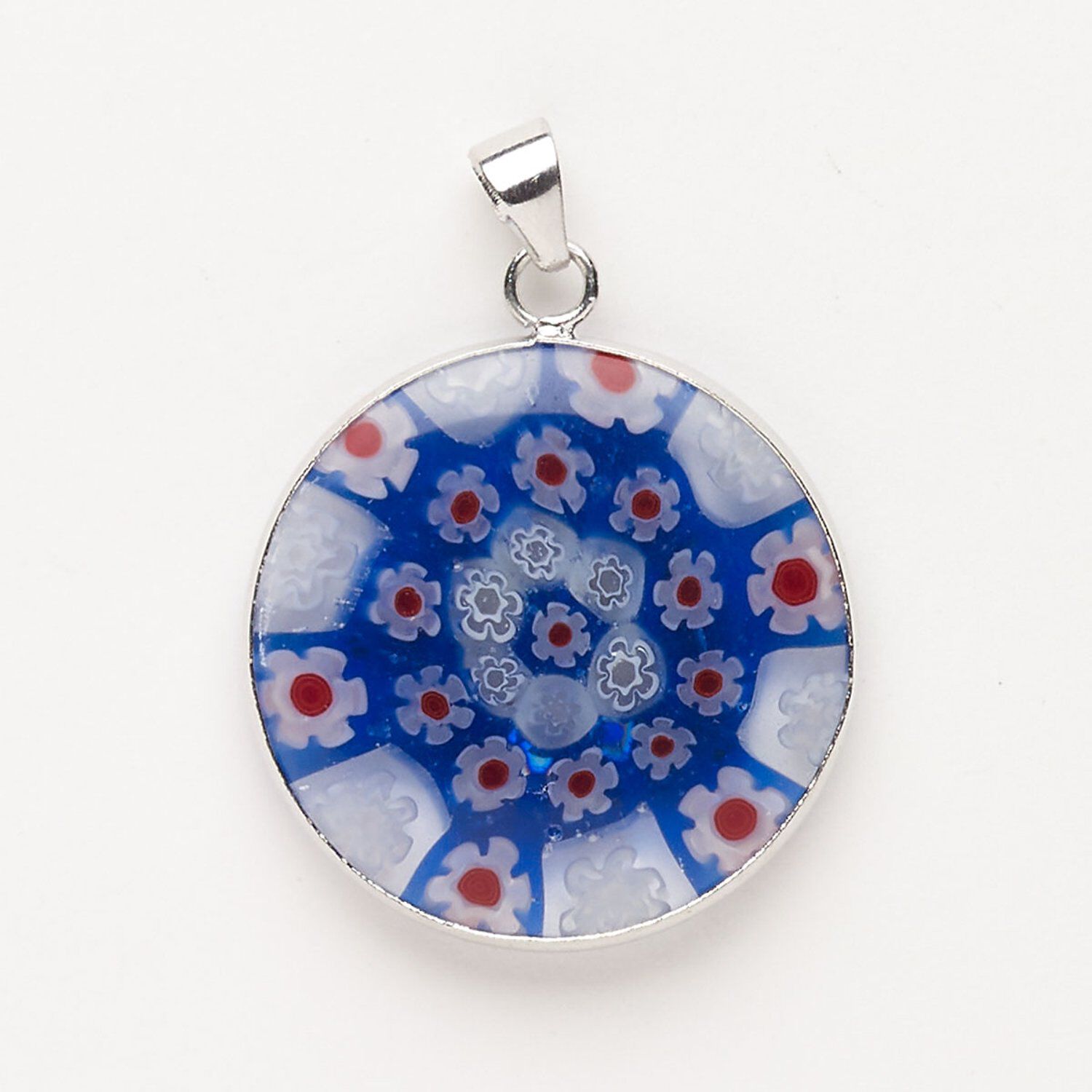 Pendant, "pewter" (zinc-based alloy) / brass / millefiori glass, pkg/1, 29mm round, silver finish and translucent multicolored.
