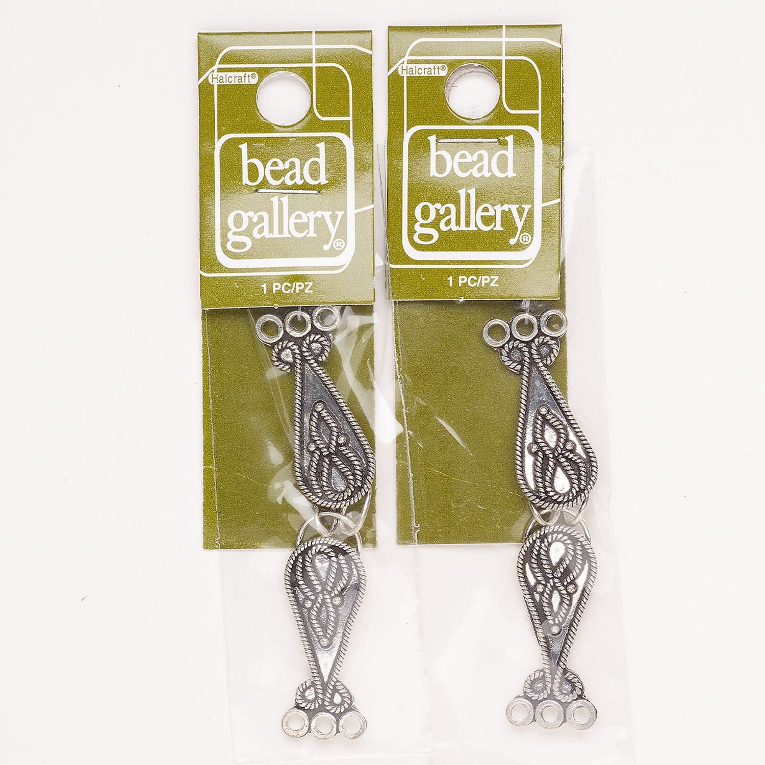 Clasp hook&eye 1pkg2 "pewter" (zinc alloy), 52x12mm teardrop, antique silver-finished 3-strand