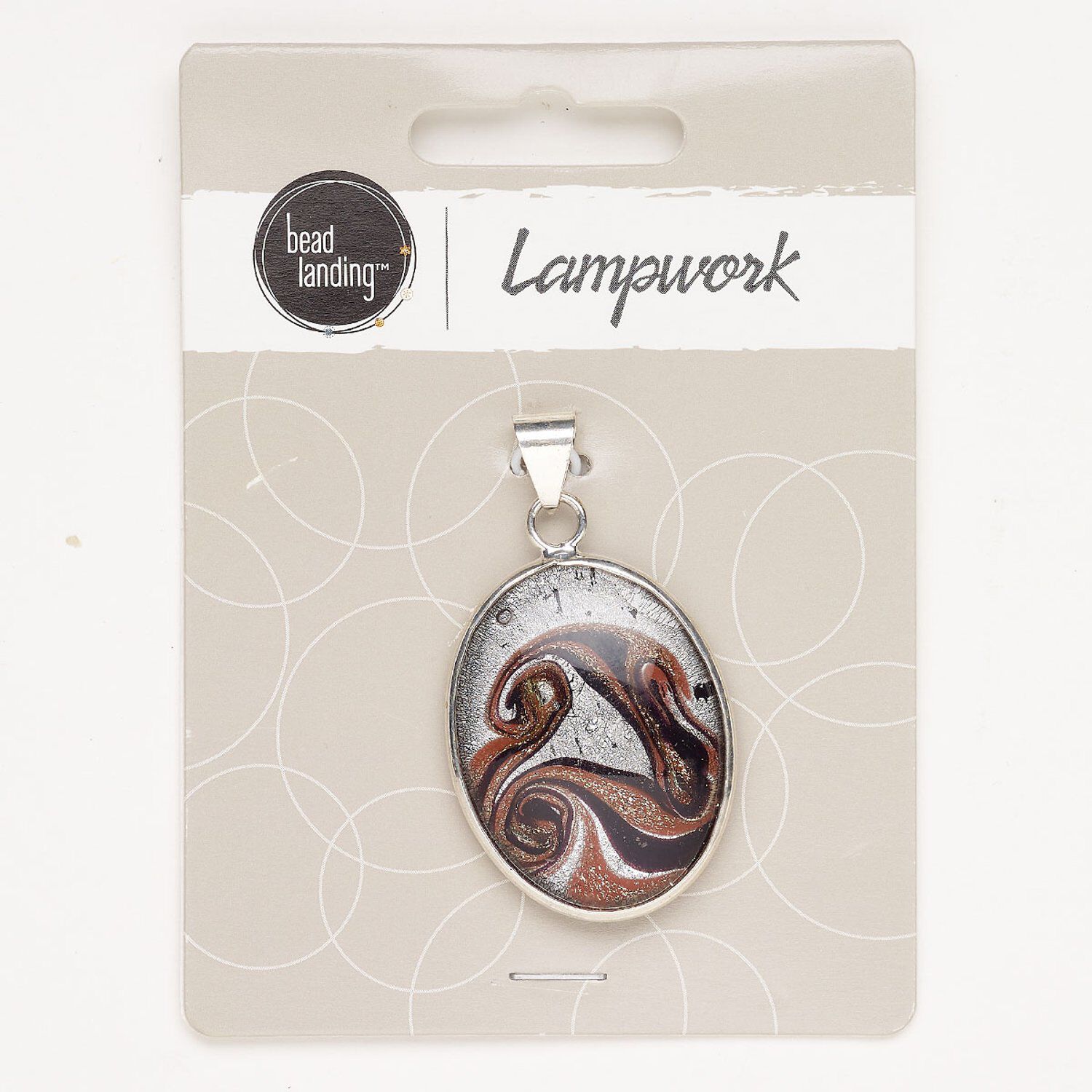 Pendant brass lampworked glass 1pk 34x27mm-35x27mm oval, silver finish black copper-colored glitter