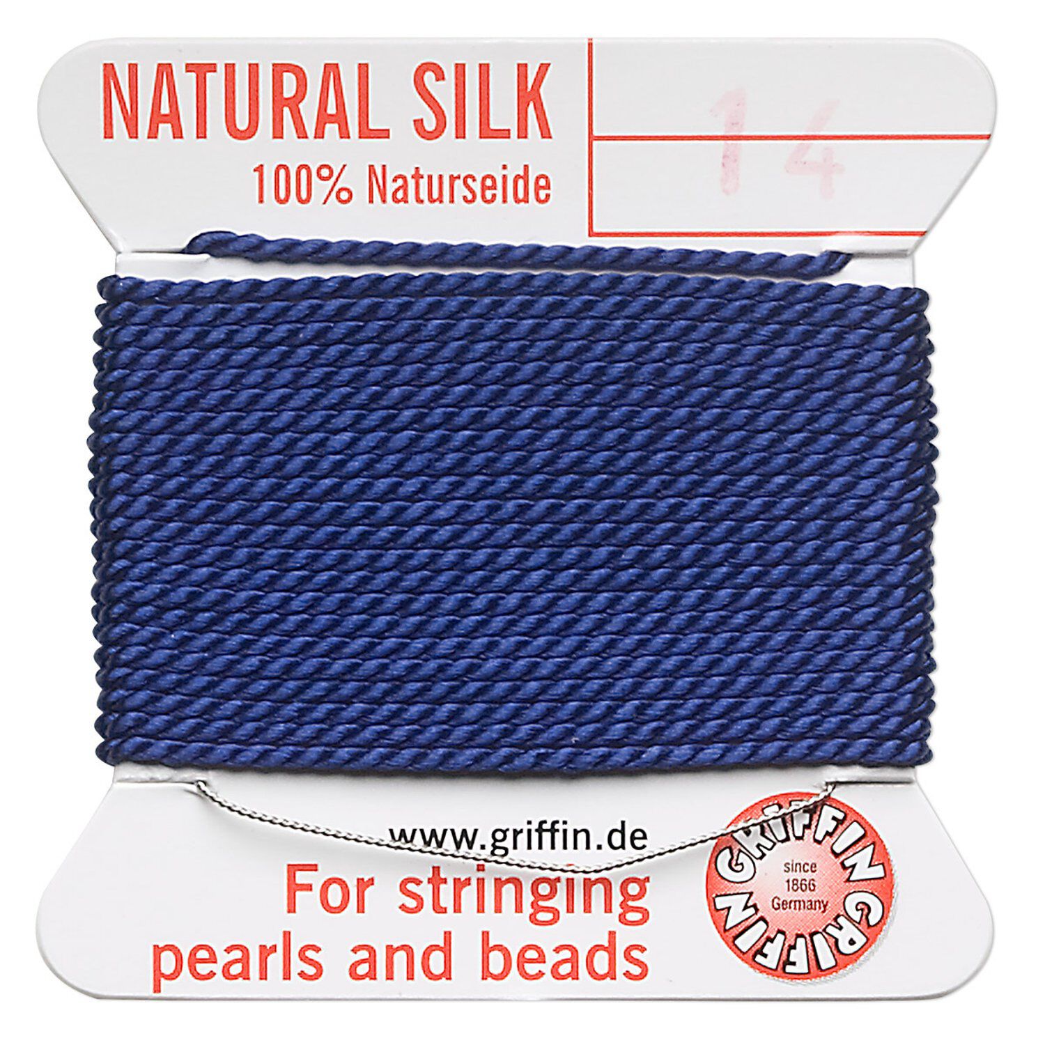 Thread, Griffin, silk, dark blue, size #14. Sold per 2-meter card (approximately 78 inches).
