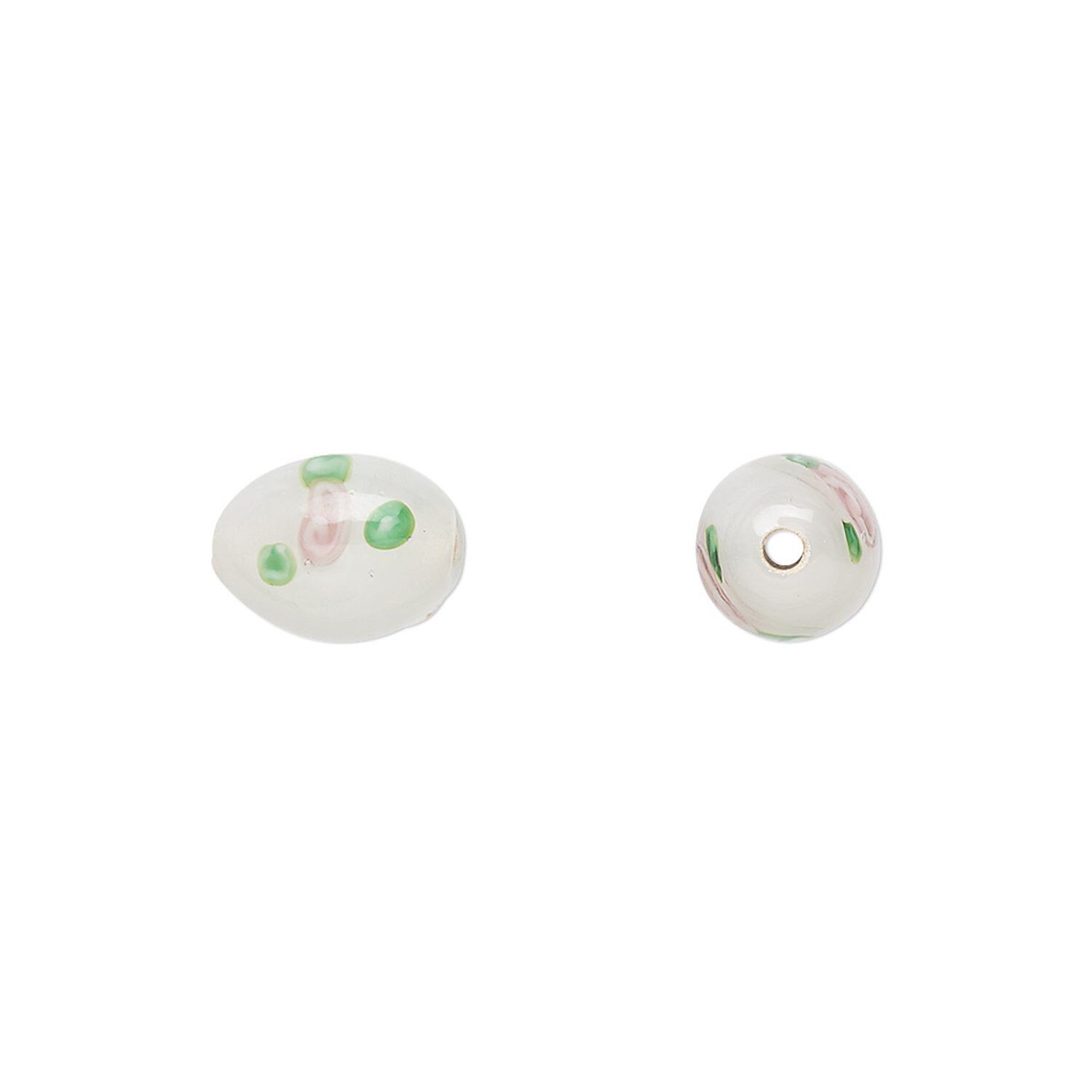 Bead, Czech lampworked glass, opaque white / pink / green, 9x6mm-10x7mm olive with flower design. Sold per pkg of 4.