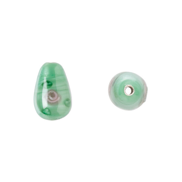 Bead, Czech lampworked glass, opaque green and pink, 12x8mm-13x9mm teardrop with flower design. Sold per pkg of 4.