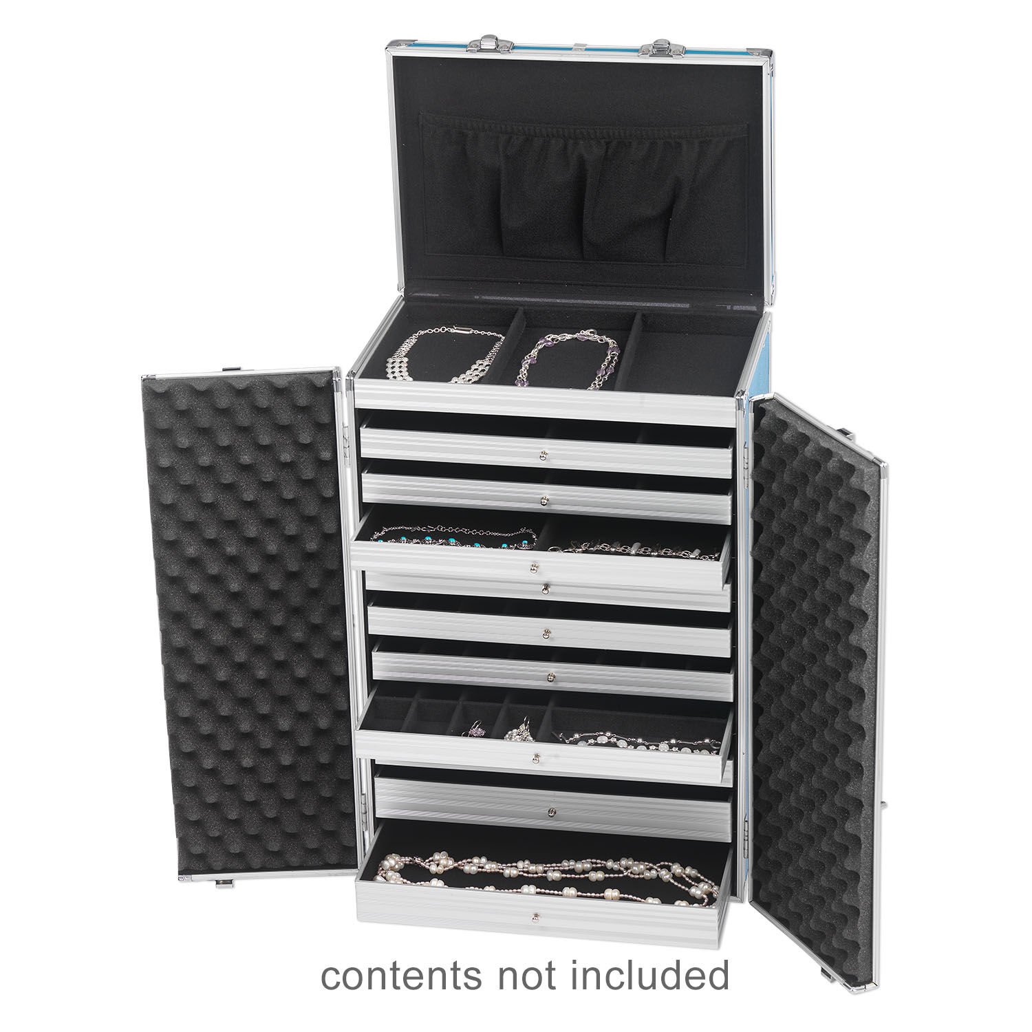 Easily transport and present jewelry items securely in a sturdy professional display. Extendable pull handle and top handle for easy lifting with a fixed trolley for simple maneuvering. Case has 2 wheels (back.) An ideal heavy-duty hard case complete with 10 removable interior drawers, all with black brushed tricot lining including various dividers, sizes and compartment inserts to keep items safe and secure during travel. Drawer layout includes: 2 with no dividers; 2 with 2 compartments; 2 with 6; 2 with 8; 2 with 15. Compartment dividers are stationary. An upgrade from plastic carrying cases, this display will help take your beading business to the next level. Case design may vary slightly.