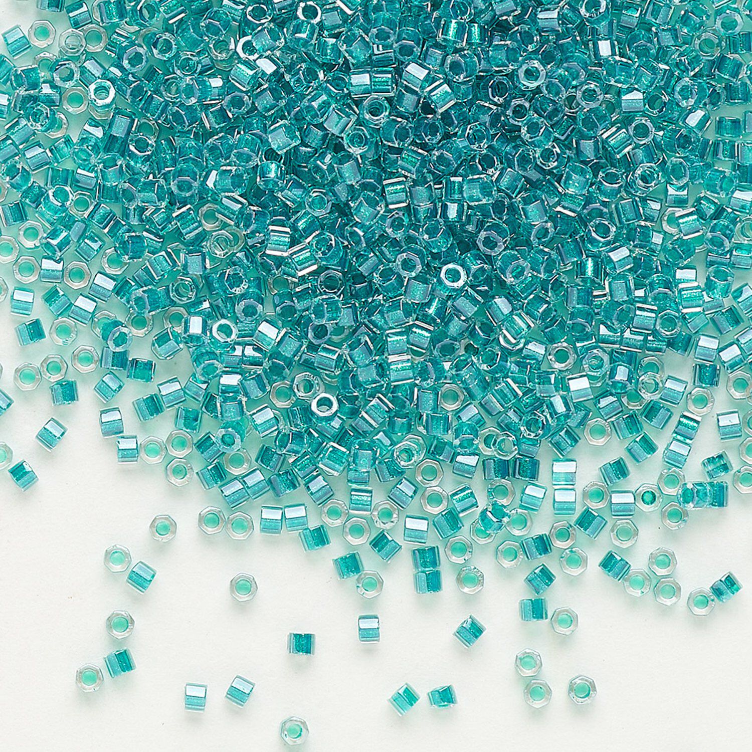 Seed bead, Delica®, glass, pkg/250g, #11 cut, translucent dark aqua-lined luster crystal clear (DBC-0918).