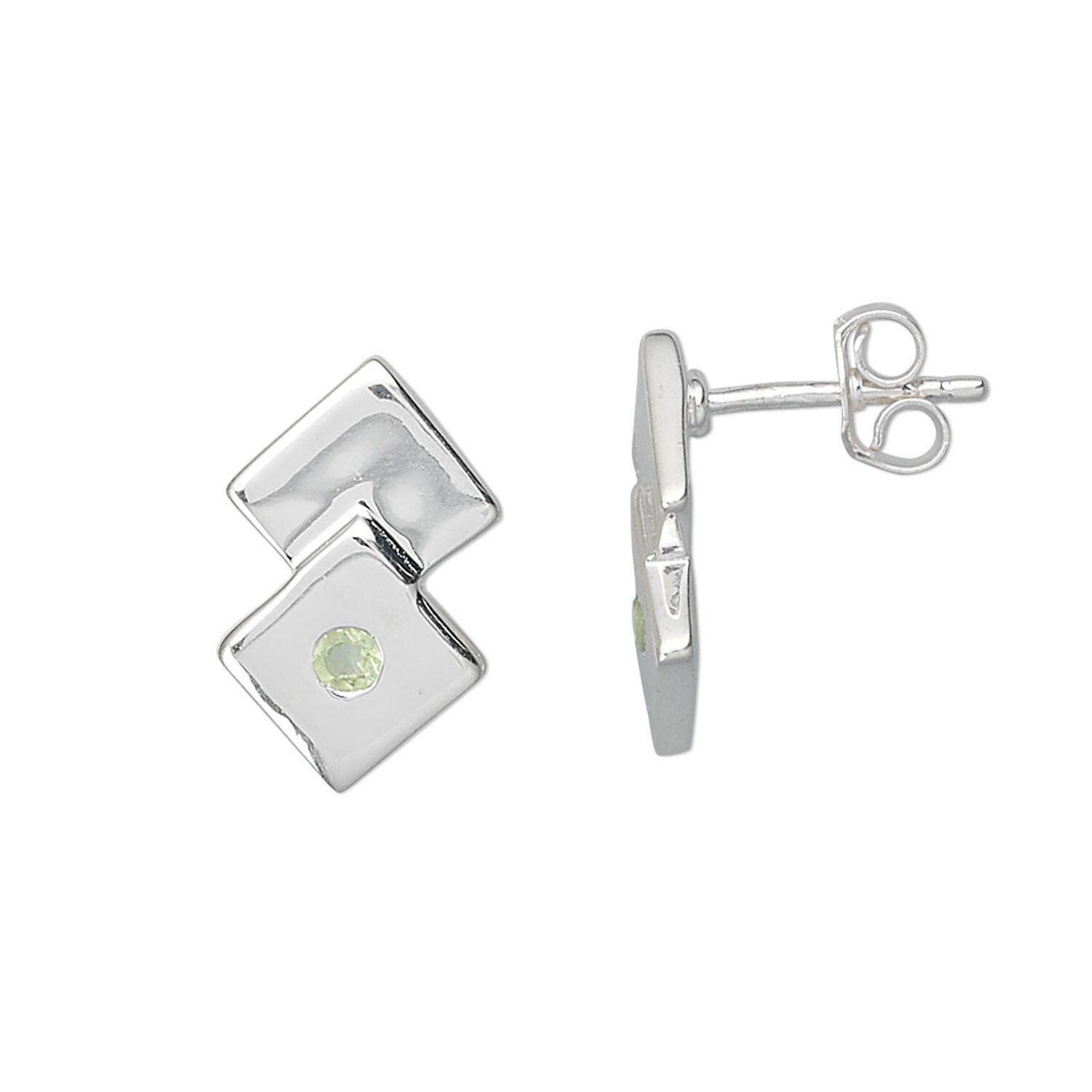 Earring, sterling silver and peridot (natural), 2mm round, 15x9mm double diamond. Sold per pair.