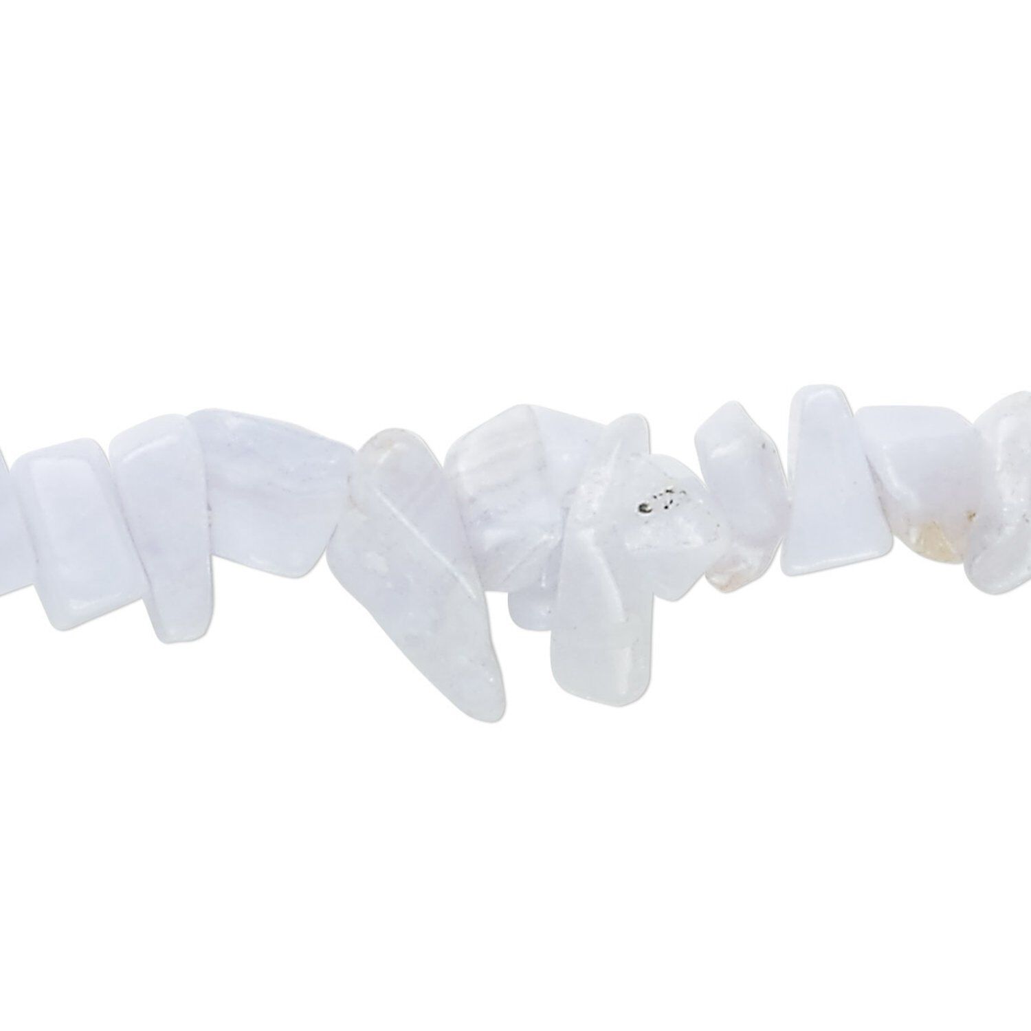 Delicate looking, in blended hues of medium blue, light blue and white that are finely banded. Chips range from small to extra-large with an average size of large.