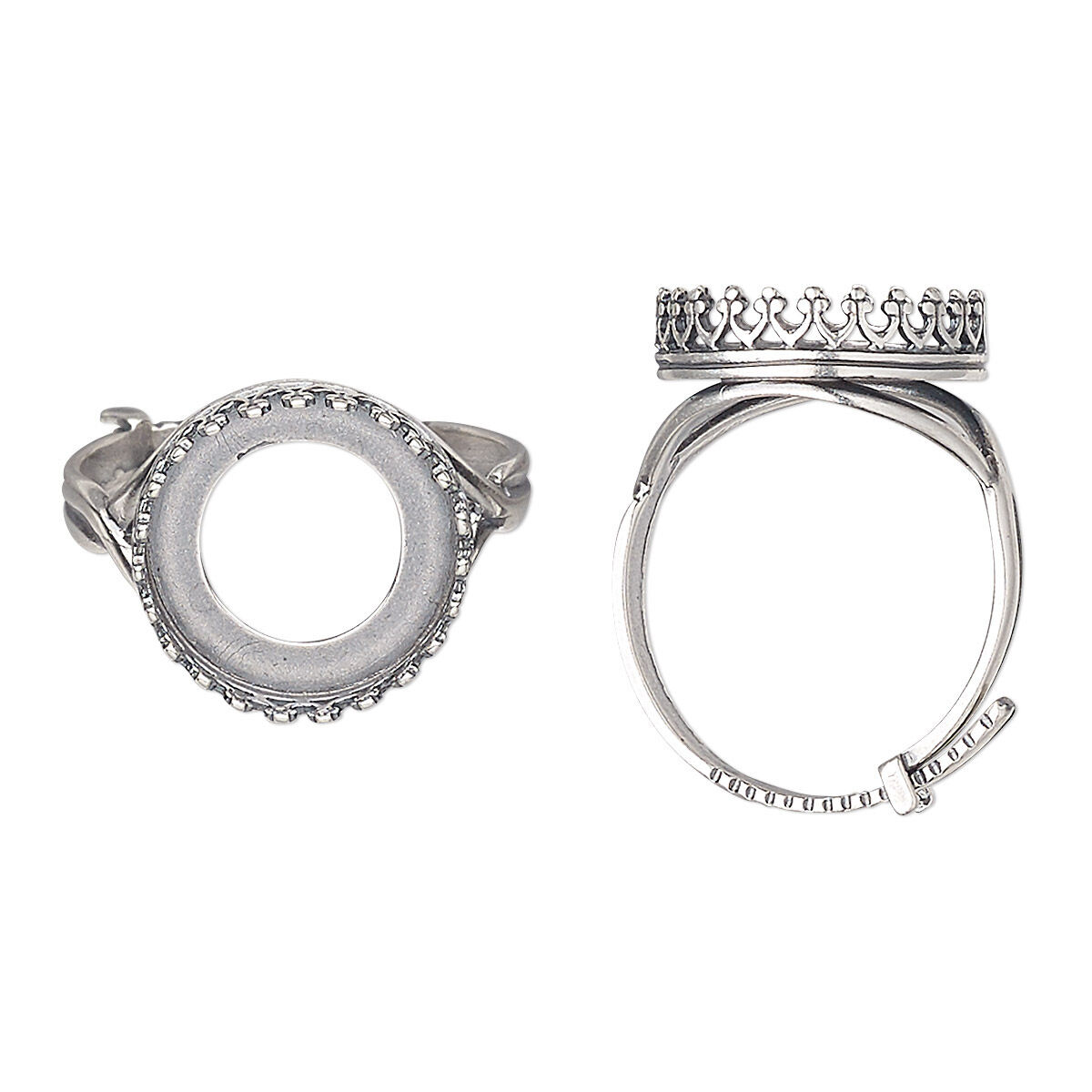 Decorative brass ring finding from JBB Findings is finished with antique silver plating and has a round bezel calibrated specifically to fit a 14mm round cabochon. Can also be used with ICE Resin® and clay designs to display small pictures and artwork. Adjustable band fits ring sizes 8 to 11.