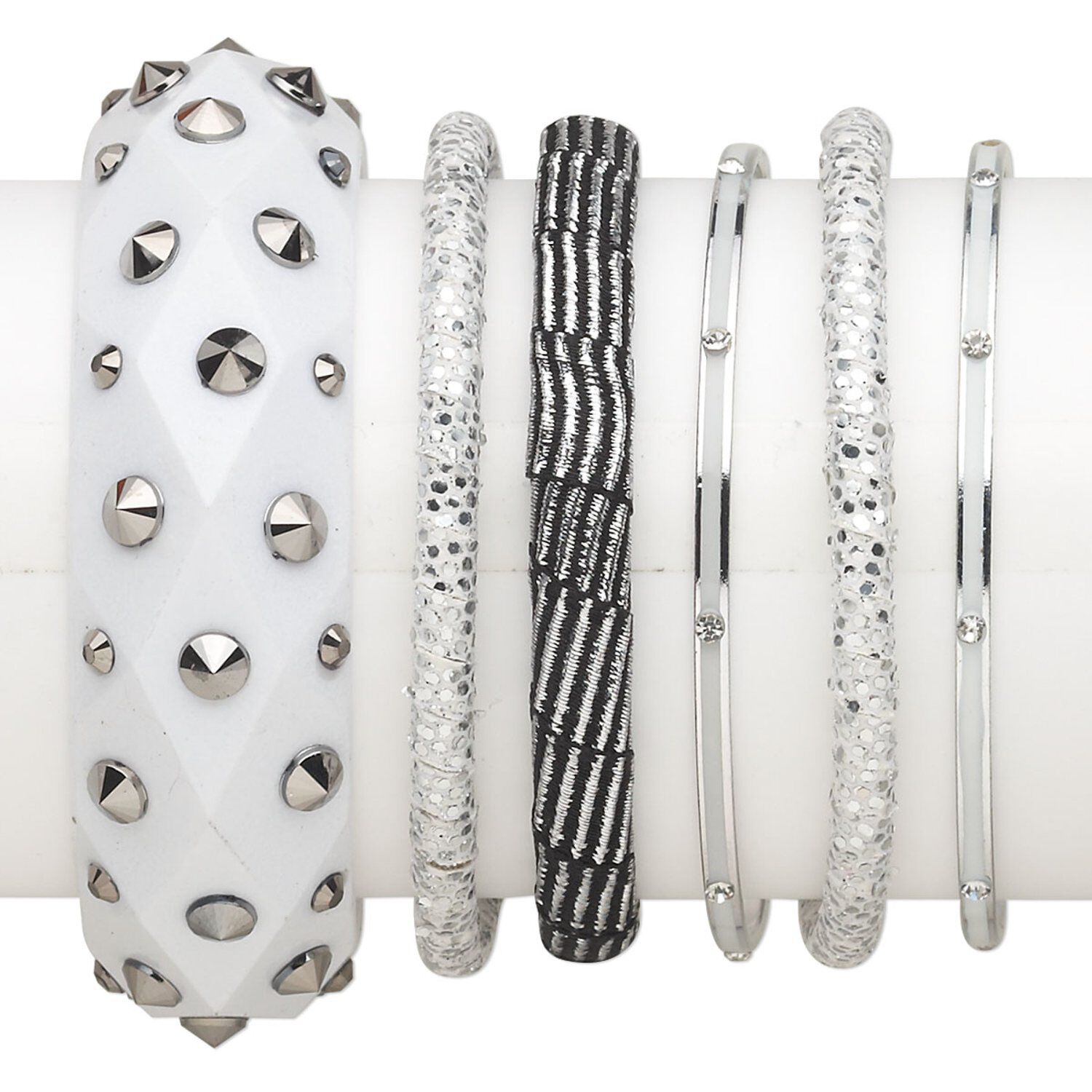 Bracelet mix, bangle, wood (dyed) / leatherette / plastic / enamel / polyester / silver-finished steel, white / silver / clear, 3-24mm wide with mixed design, 7-1/2 inches. Sold per 6-piece set.