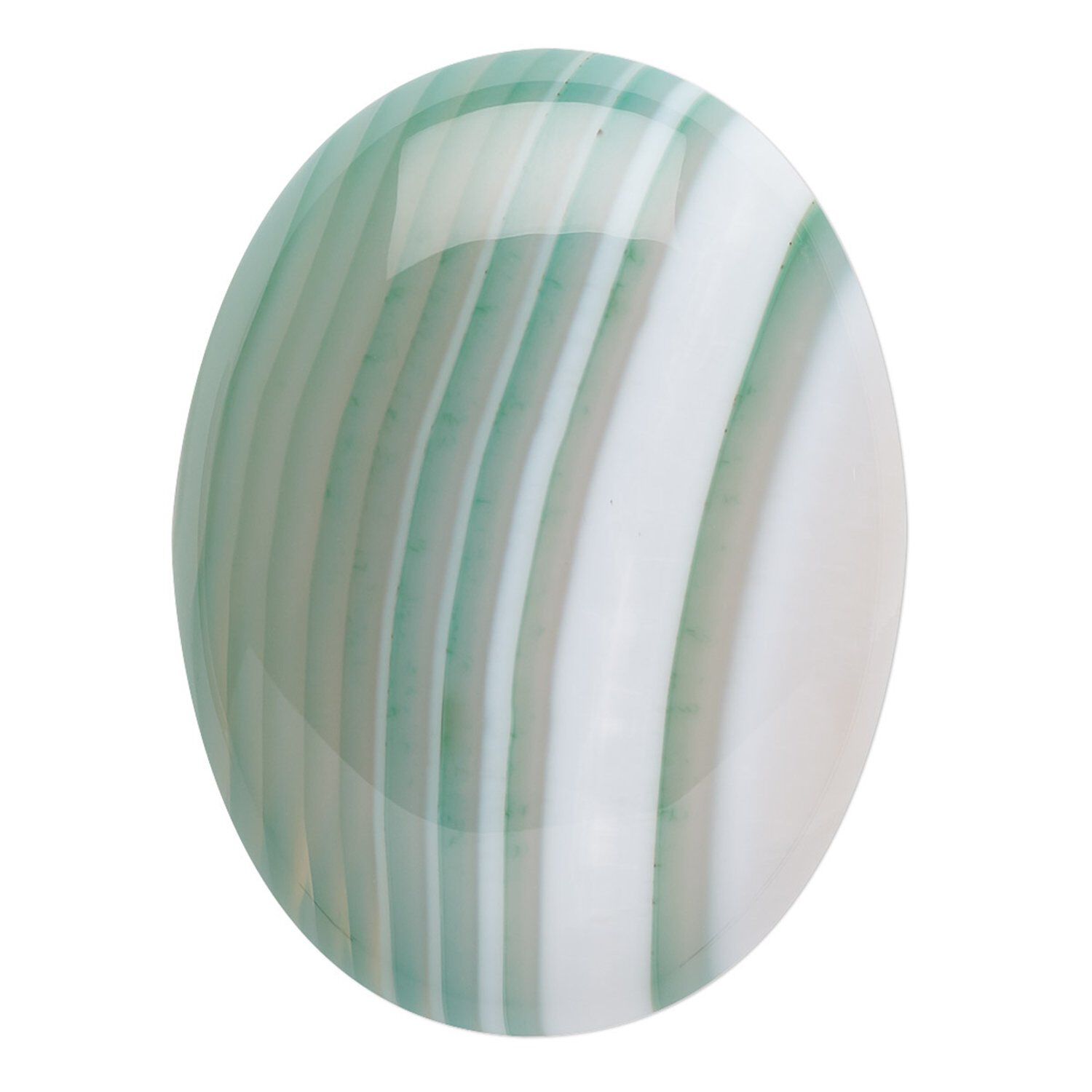 This striped agate cabochon features natural banding and have been dyed green, offering a more understated striping and color intensity than their cousins, crazy lace agate. Colors can include dark green, light green, grey, clear and white.