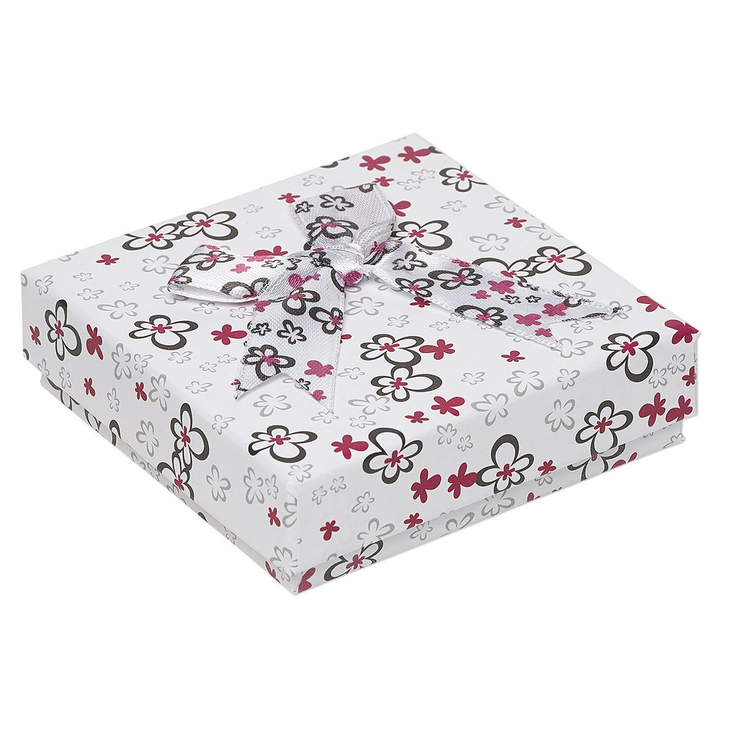 Make every jewelry sale memorable by presenting jewelry sets in these oh-so-cute, floral gift boxes with matching ribbon on top. Each lightweight, paper-covered cardboard box contains a leatherette-covered insert with slots and a hook for displaying a necklace, earrings and ring. Colors can include white, black, pink and grey.
