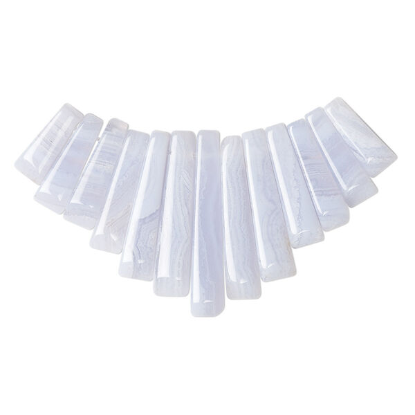 Blue lace agate is semitranslucent and pale blue with fine blue and white banding. Each fan set includes 13 graduated pieces that create a striking focal piece. Size and thickness may vary from package to package.