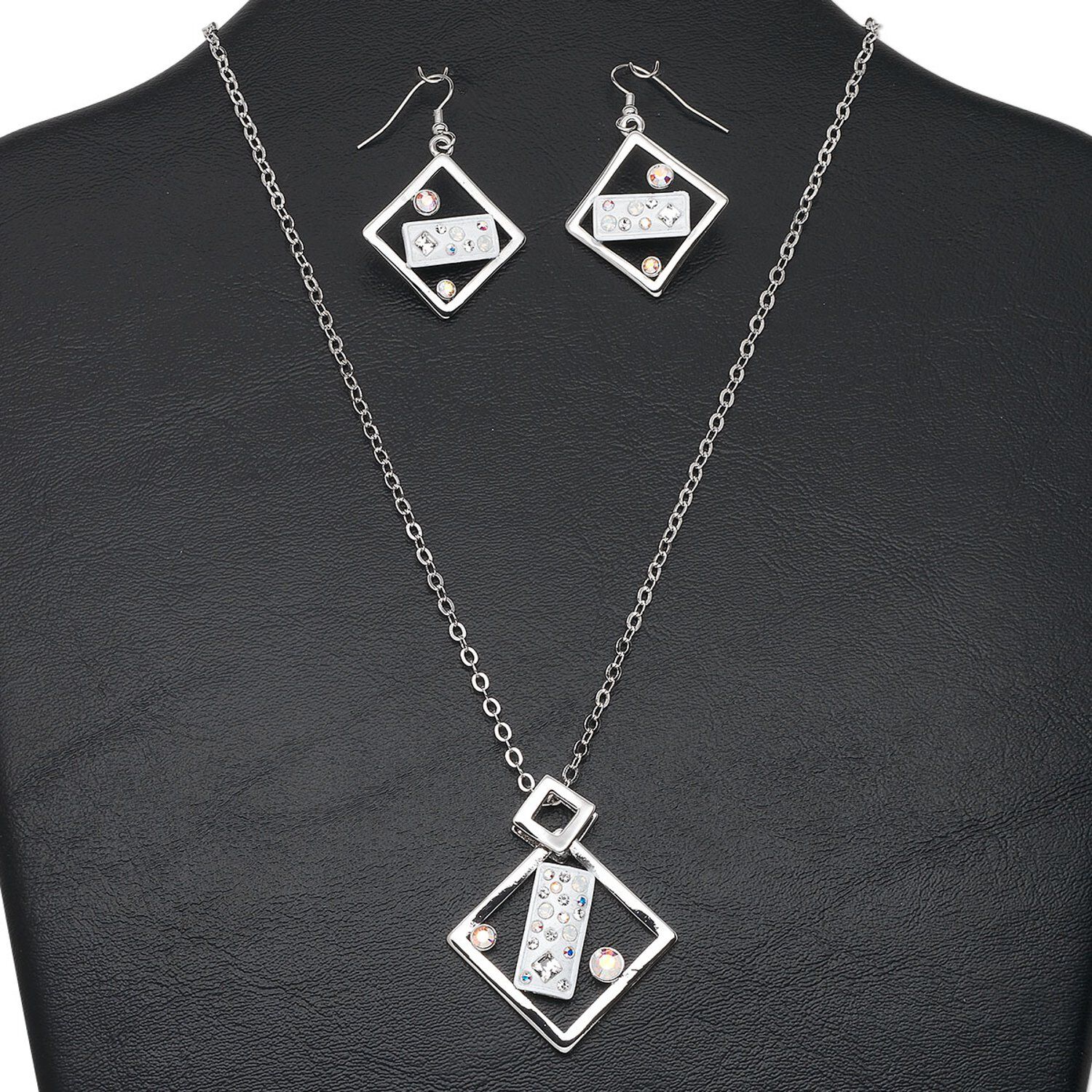Necklace and earring set, imitation rhodium-finished "pewter" (zinc-based alloy) and brass / epoxy / Austrian crystal / white opal (synthetic), white and clear AB, 40x40mm openwork diamond, 17-1/2 inches with lobster claw clasp and 3-inch extender chain, 48x29mm earrings with fishhook ear wire. Sold per set.
