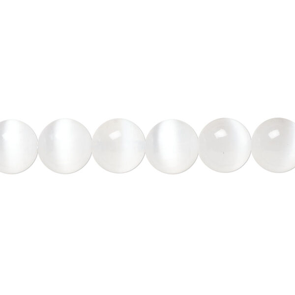 These beads are crafted from a soft, luminous stone, a variety of gypsum, that has been specially coated to enhance their durability, polish and luster. A translucent white stone, selenite can have inner striations, giving areas of the material a cat's eye appearance.