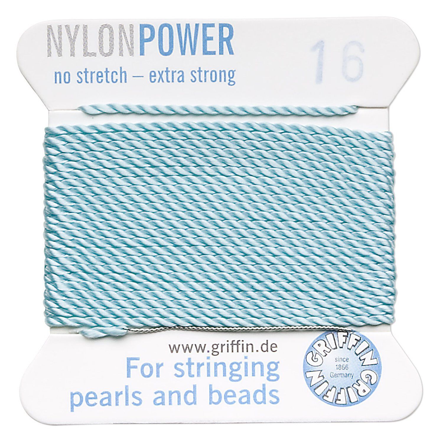Thread, Griffin, nylon, turquoise blue, size #16. Sold per 2-meter card (approximately 78 inches).