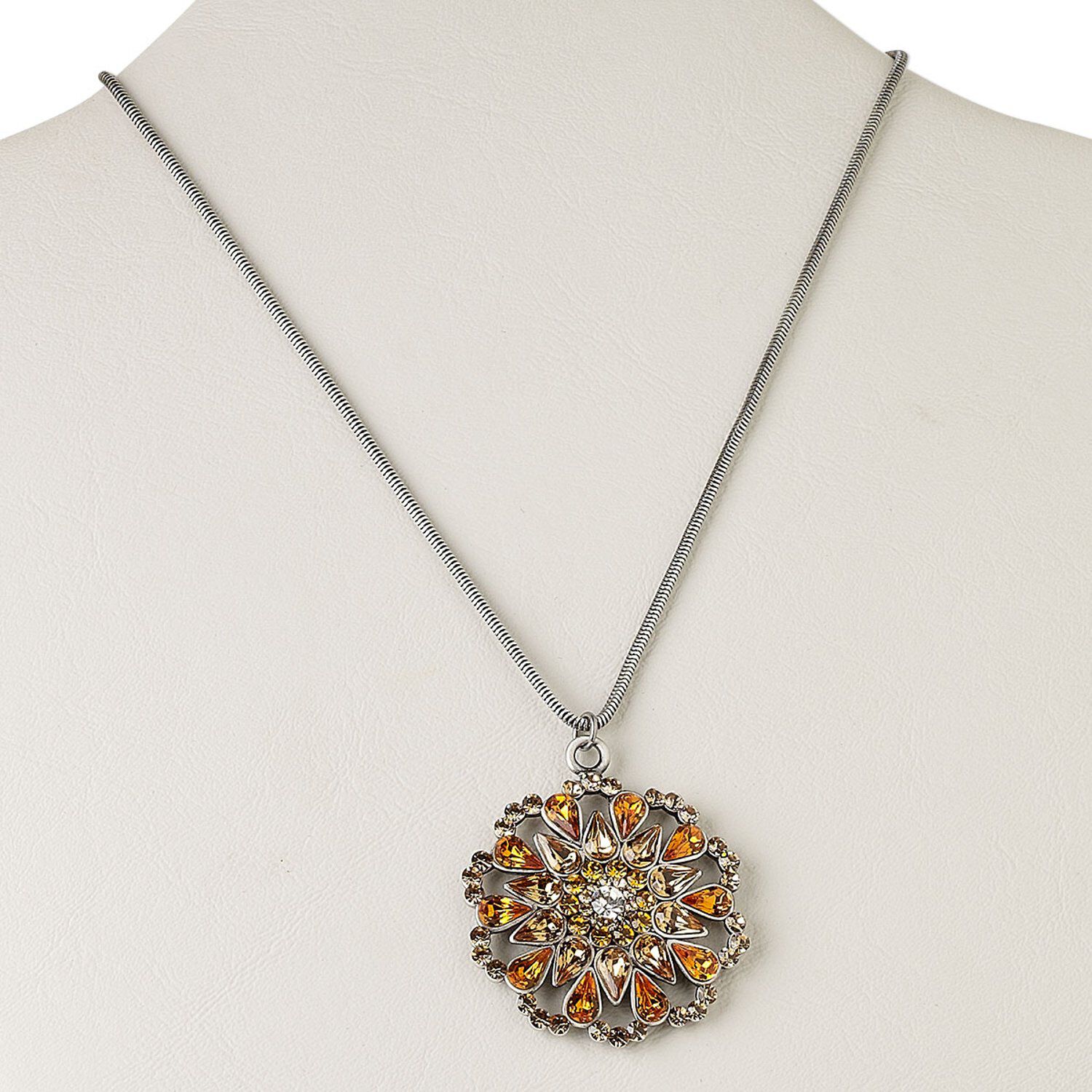 Necklace, antiqued silver-plated brass and crystal rhinestones, peach and amber, 43mm fancy round, 15" to 16" snake chain with 2-inch extender chain. Sold individually.