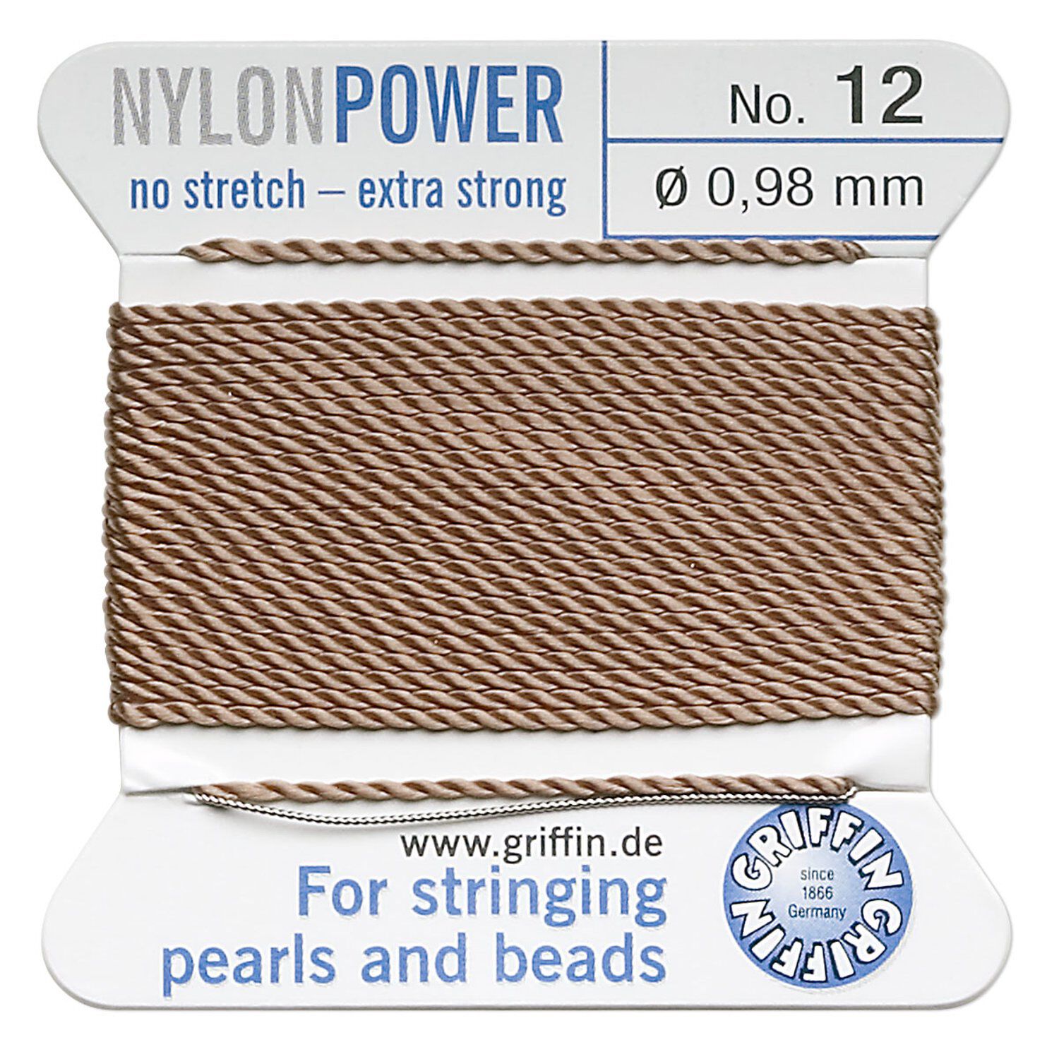 Thread, Griffin, nylon, beige, size #12. Sold per 2-meter card (approximately 78 inches).