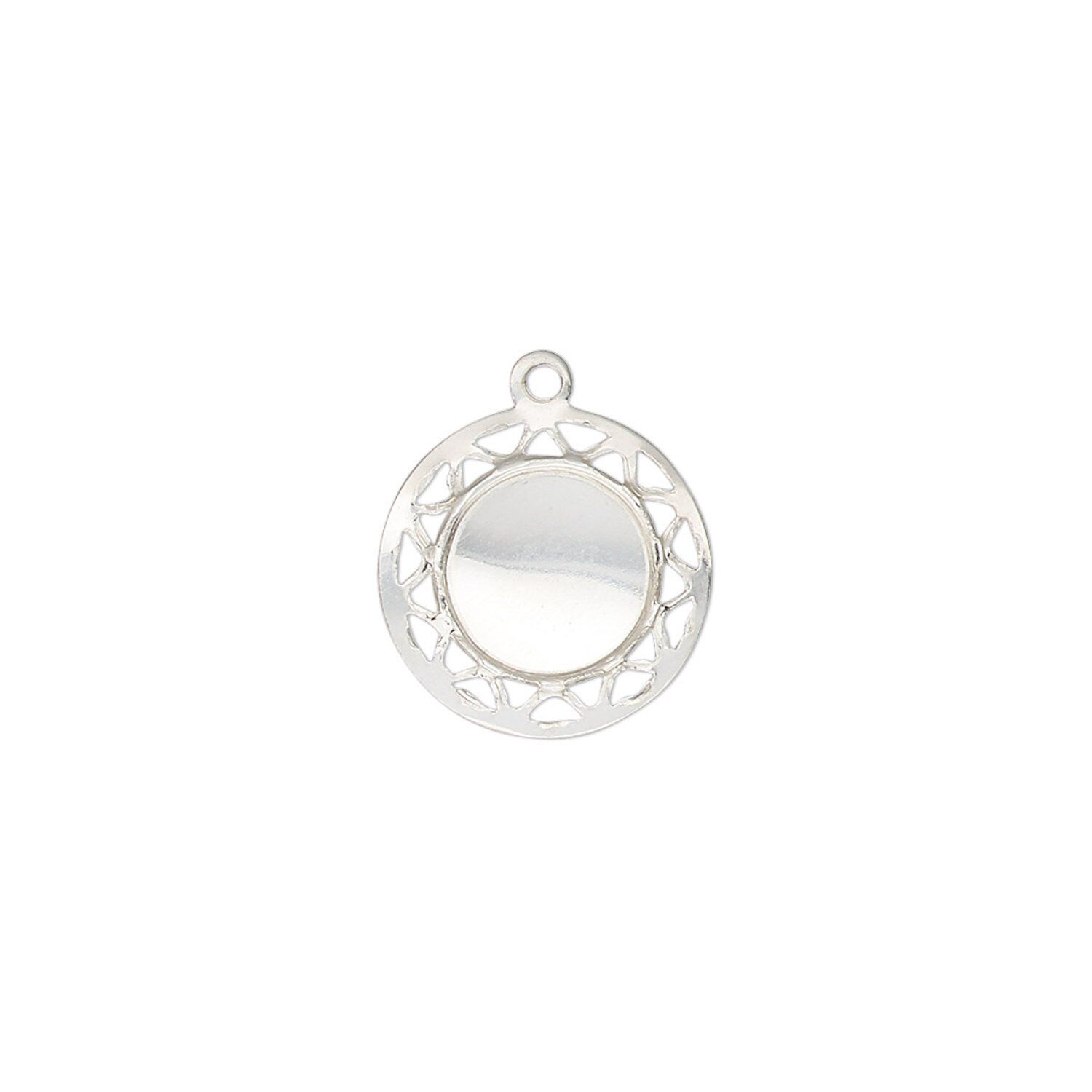 Drop, sterling silver, 13mm single-sided round with patterned border and 8mm round setting. Sold individually.