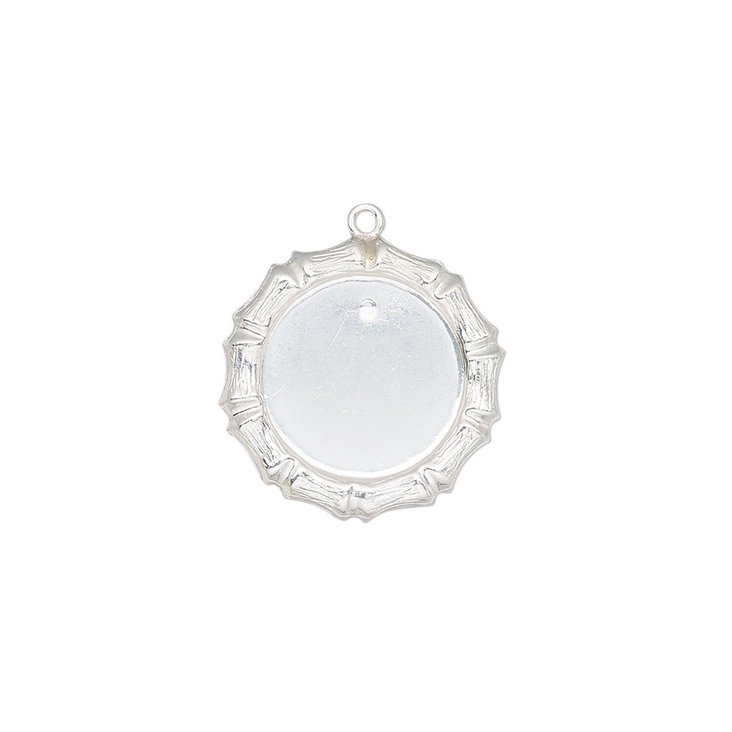Drop, sterling silver, 17mm single-sided round with bamboo edge design and 12mm round setting. Sold individually.