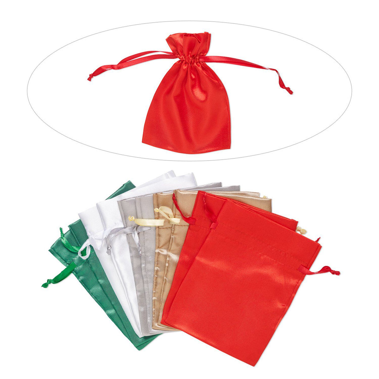 Satin gift pouches make gift-giving more special. Ideal for post-purchase wrapping for elegance that doesn't take up space. Drawstring closure wraps up the presentation with attractive security. Assorted colors ideal for Christmas and other holidays. Package includes two of each color: gold, silver, red, green and white.