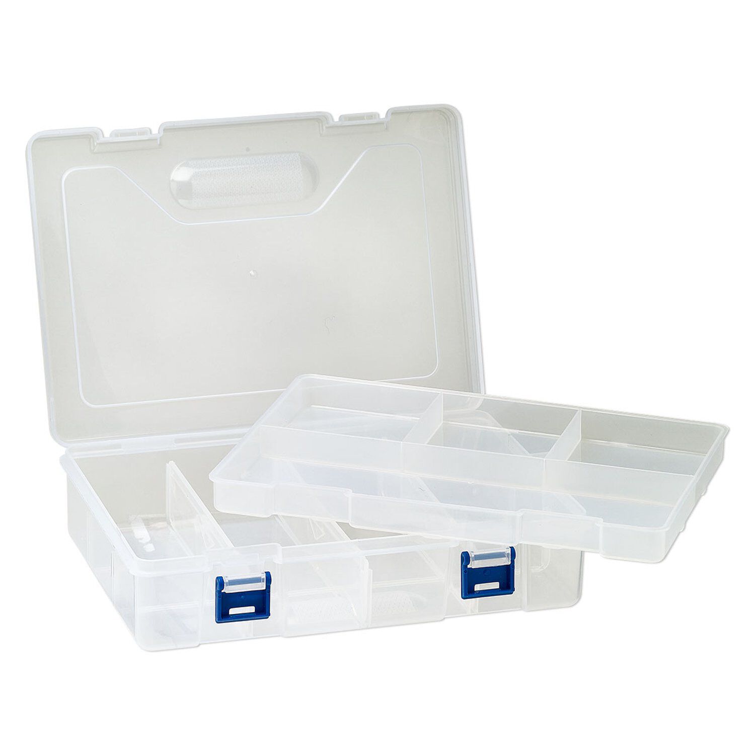 Customize your bead and jewelry-supply organization. The top level of this sturdy organizer is 3/4 inch deep with four sections. The bottom level is 1-1/2 inches deep with adjustable wall sections. Organizer features double-locking "snap up" tabs for a secure close.