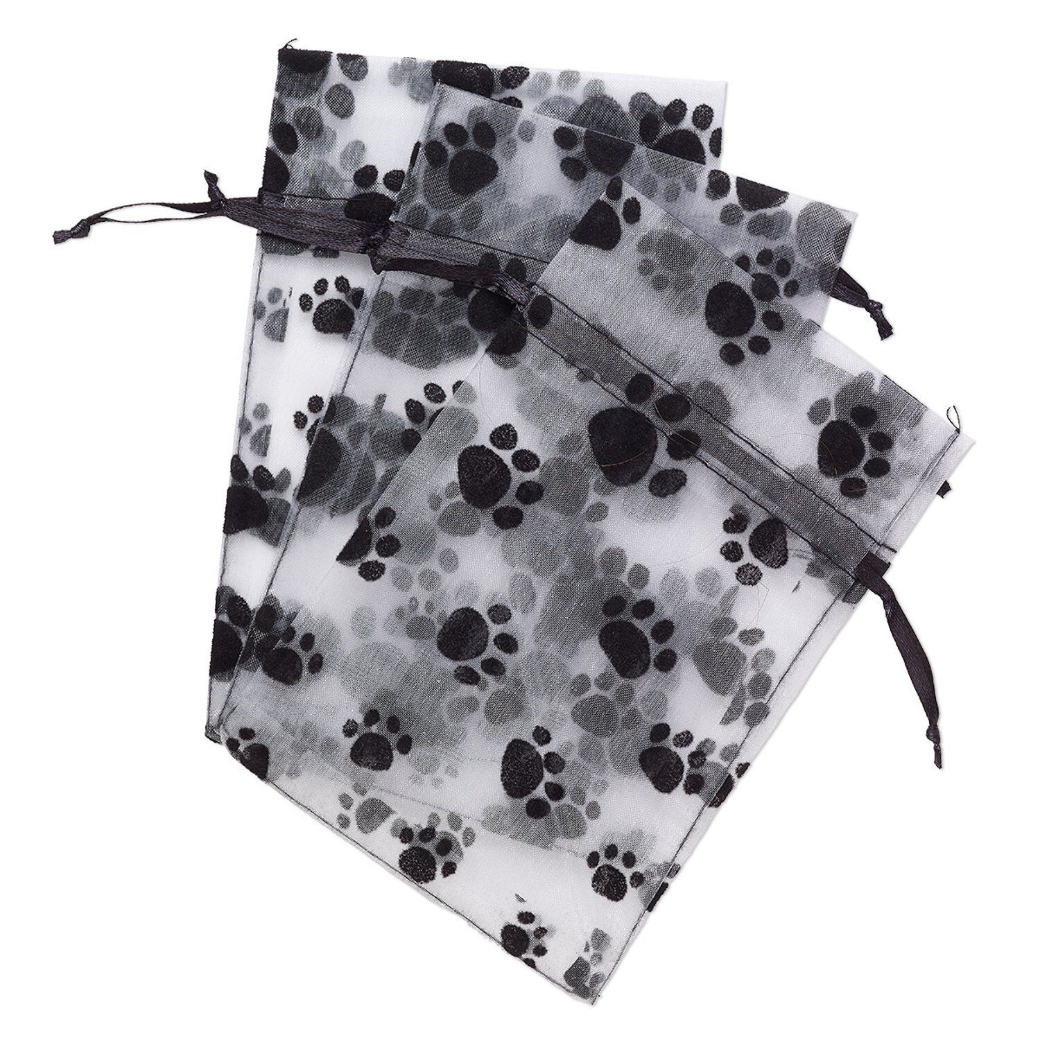 Grey organza gift pouches with paw prints pattern are ideal for pet-themed parties, animal shelter fundraisers and more. Satin ribbon drawstring closure. Suitable for reselling, gift-giving, after-sale packaging and more.