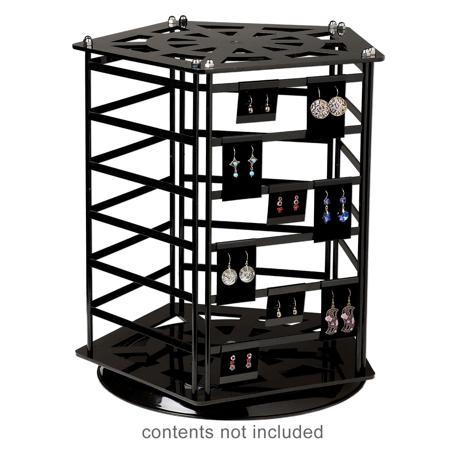 Revolving 5-sided display lets customers easily browse large selections of earrings at once. Each side has 6 bars. Quick and easy to assemble and disassemble, this 360-degree display can be used repeatedly at shows, in stores, on countertops for impulse purchases and in other places. Neutral color provides non-competing background for earrings. Accepts most sizes of hanging earring cards. Instructions included.