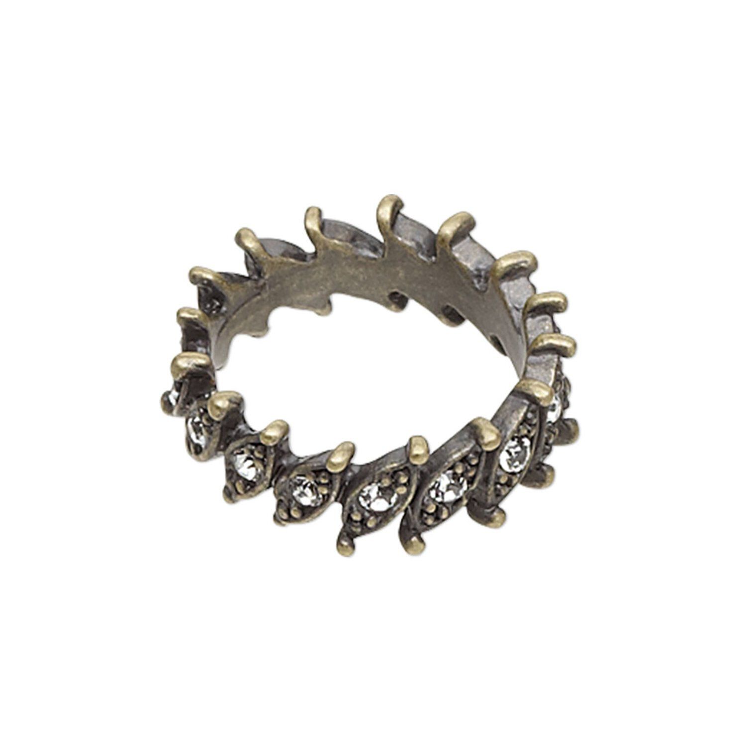 Antiqued brass-finished "pewter" (zinc-based alloy) ring with rhinestone embellished marquise designs. Ring is size 8 and makes for a nice counter sale or a quick on-the-go accessory. Colors, shapes and sizes may vary in each lot.