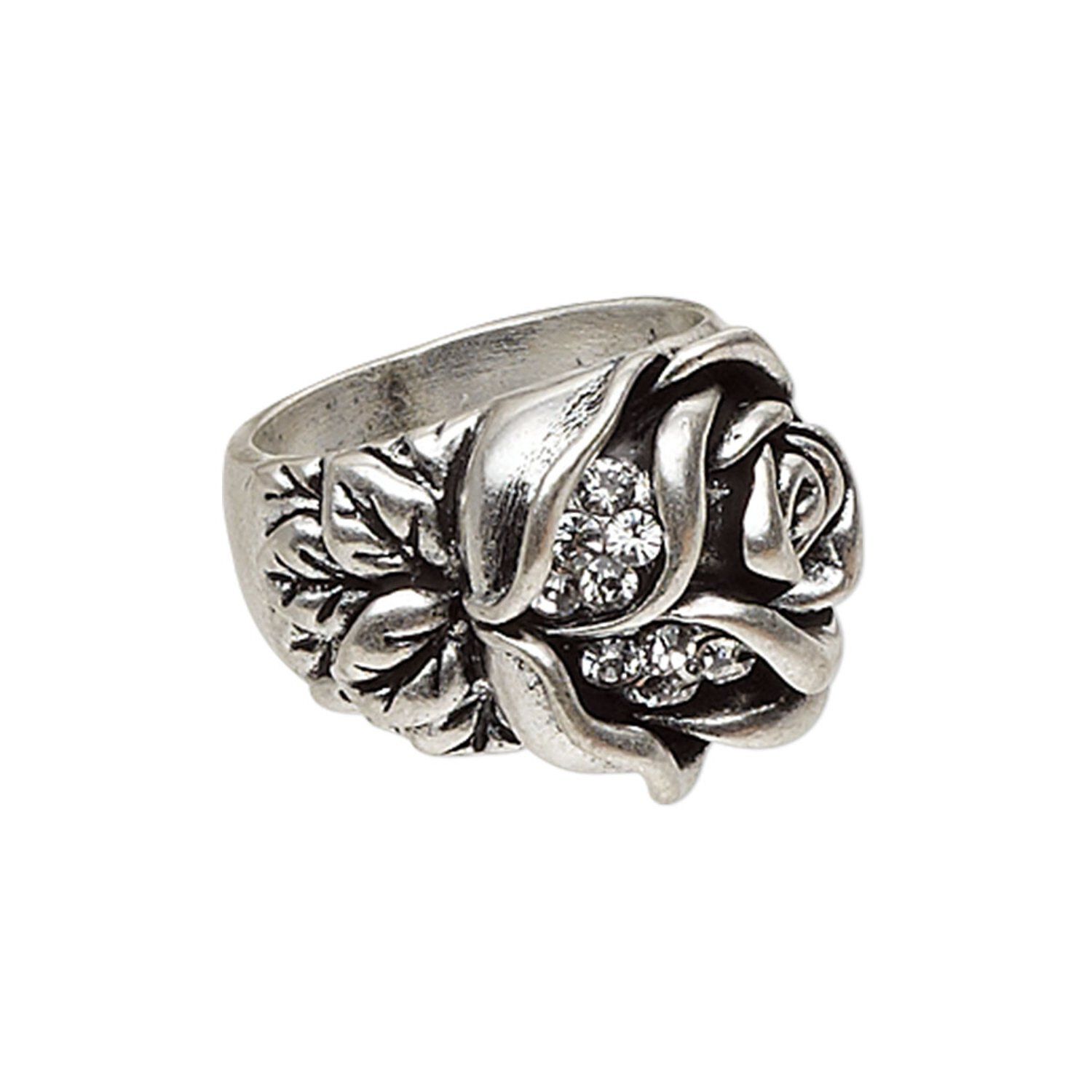 Ring, antique silver-plated "pewter" (zinc-based alloy) and glass rhinestone, clear, 18mm wide with rose design, size 8. Sold individually.