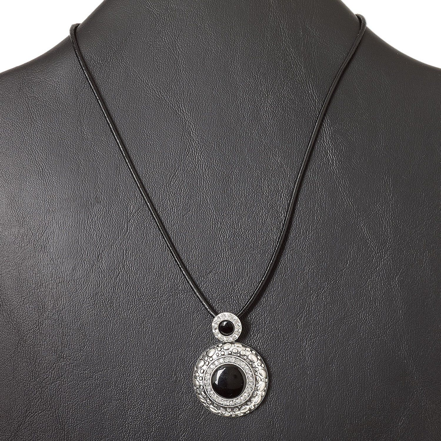 Necklace, antiqued silver-finished "pewter" (zinc-based alloy) / resin / glass rhinestone / leather (dyed), black and clear, 29mm flat round, 15" to 16" necklace with lobster claw clasp and 3-inch extender chain. Sold individually.