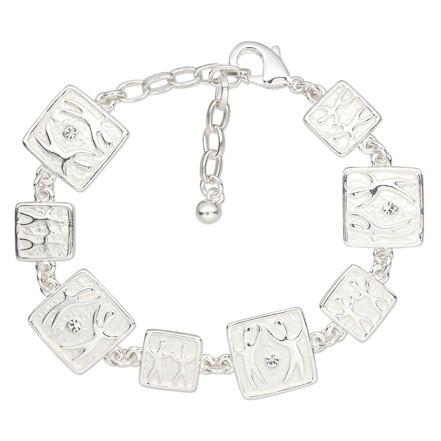Bracelet, glass rhinestone with silver-finished steel and "pewter" (zinc-based alloy), clear, 6x6mm and 10x10mm square with smooth and textured people design, 6-1/2 inches with lobster claw clasp and 3-inch extender chain. Sold individually.