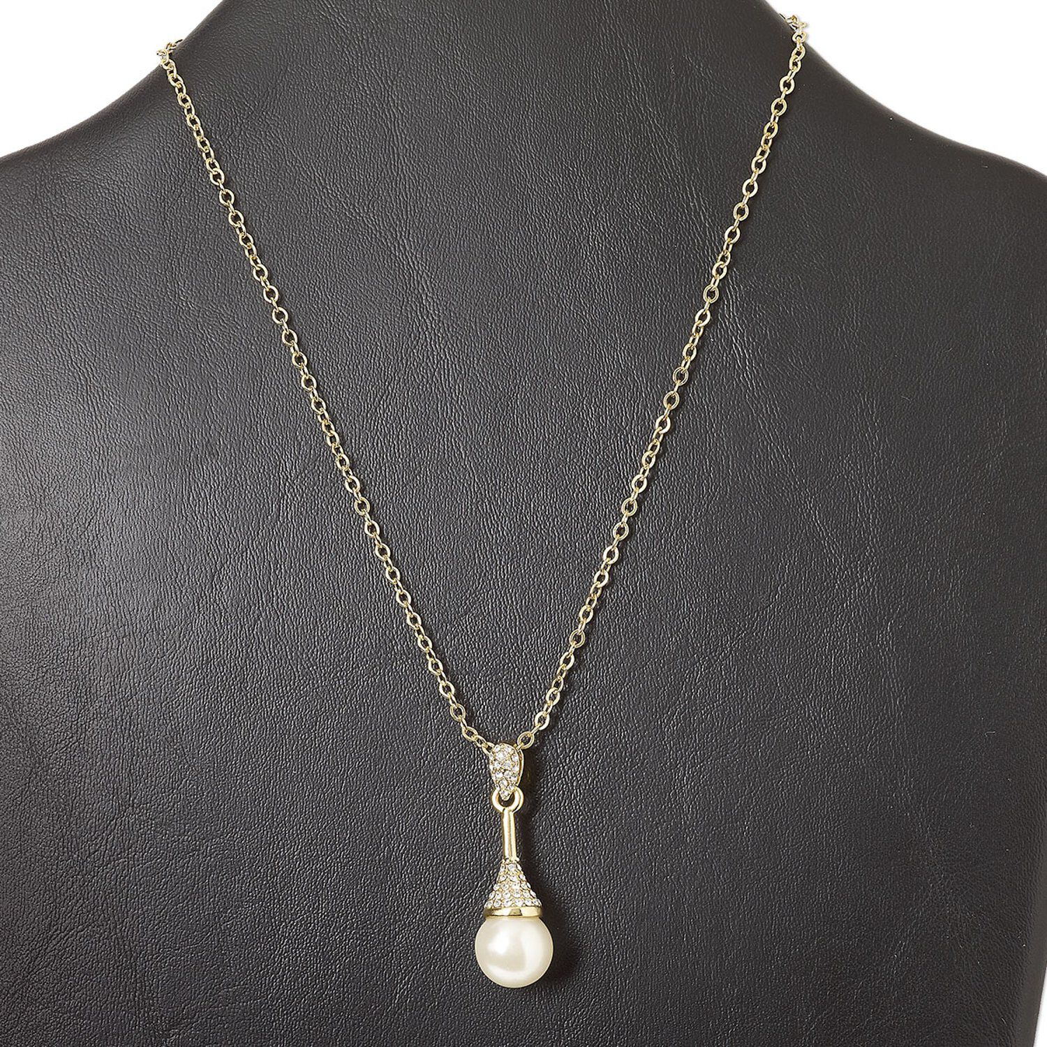 Necklace, gold-finished "pewter" (zinc-based alloy) and steel / glass rhinestone / freshwater pearl shell (bleached), clear and white, 1-1/2 inch dangle, 15" to 16" necklace with lobster claw clasp and 3-inch extender chain. Sold individually.