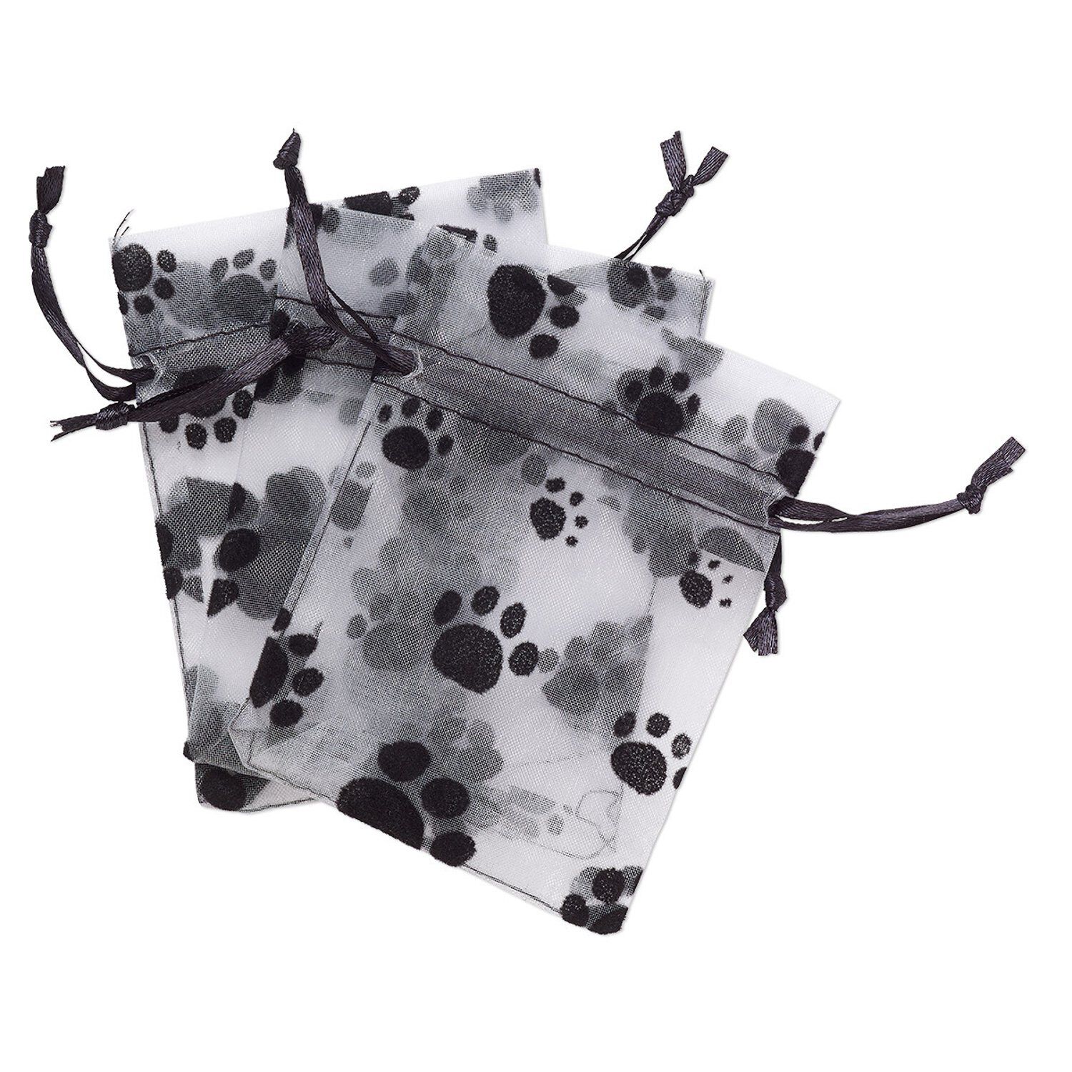 Grey organza gift pouches with a paw print pattern are ideal for pet-themed parties, animal shelter fundraisers and more. Pouches feature a satin ribbon drawstring closure. Suitable for reselling, gift-giving, after-sale packaging and more.