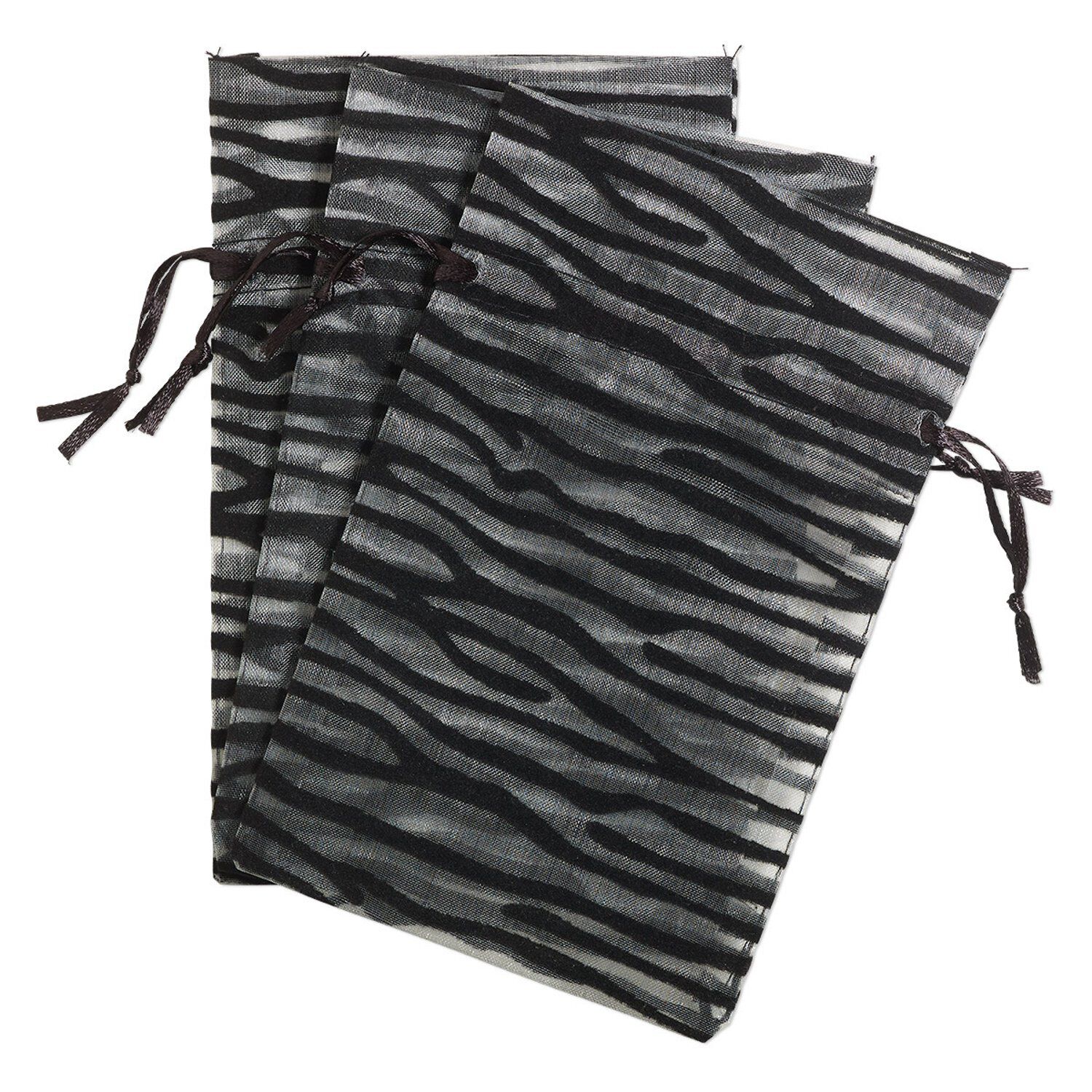 Decorative organza pouches feature a flocked zebra stripe design for maximum gifting style. Pouches have satin drawstring cinch-top closures. Suitable for reselling, gift-giving, after-sale packaging and more.