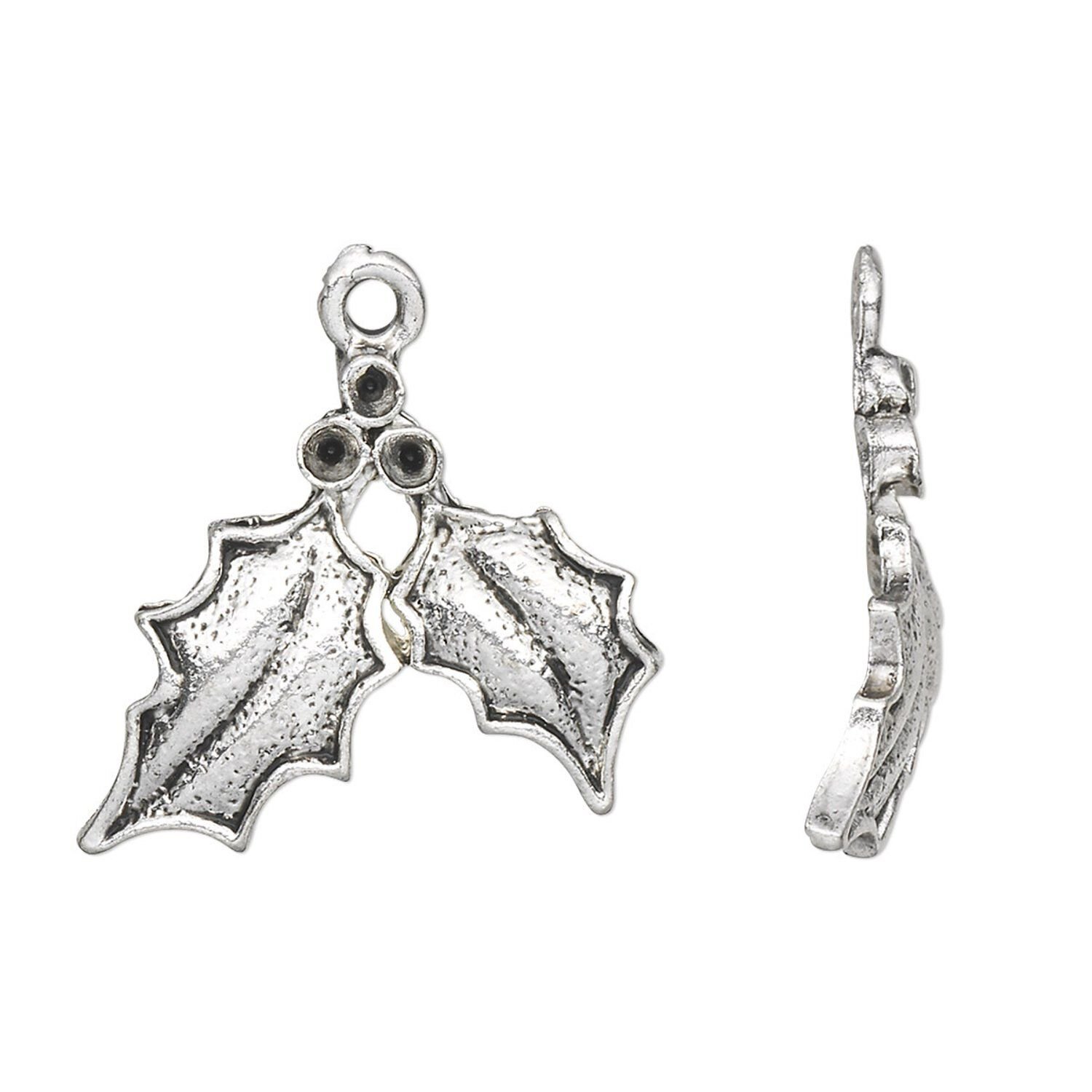Charm, antique silver-plated "pewter" (zinc-based alloy), 25x19mm single-sided holly leaves with (3) PP15 settings. Sold per pkg of 10.